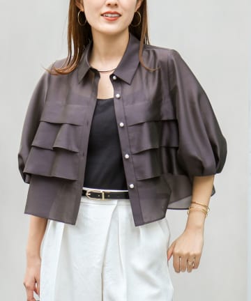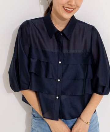 シアーシルキーパール釦フリルブラウス