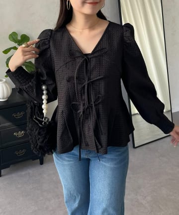 フロントシャーリングパフスリーブジャガードペプラムブラウス