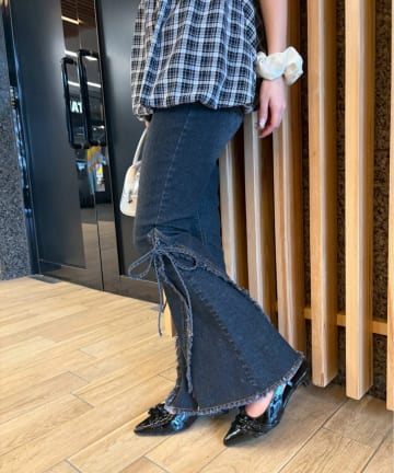 【-3キロ見え美シルエット】フリンジ切替えリボンフレアデニム