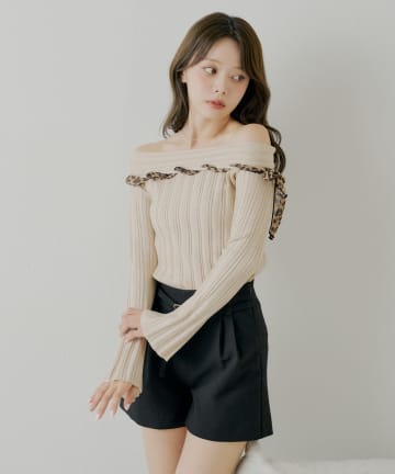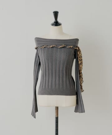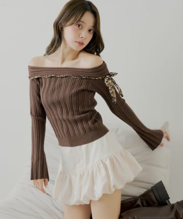 レオパード肩リボンオフショルリブニット