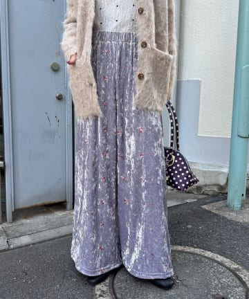 ラインストーンフラワー刺繡ベロアワイドパンツ