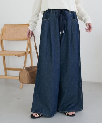 ハイウエストステッチ使いデニムワイドパンツ