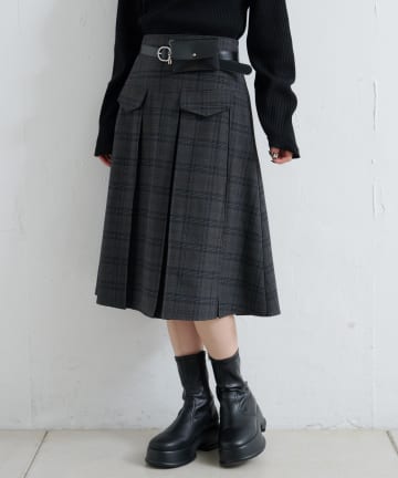 【チェック&無地/一部店舗限定】ベルトプリーツミドルスカート