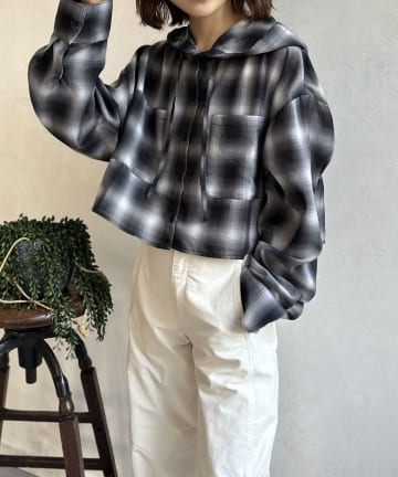 【シアー素材】フードチェックショートシャツ