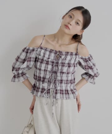 【Chico】ギャザーデザインチェックブラウス