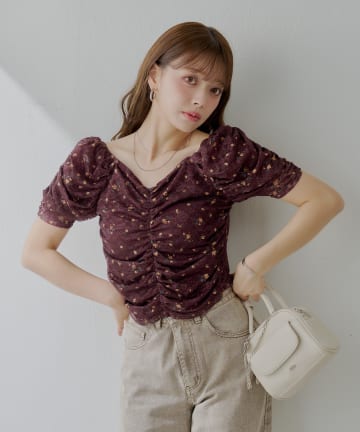 【Chico】チョーカー付きフラワープリントギャザートップス