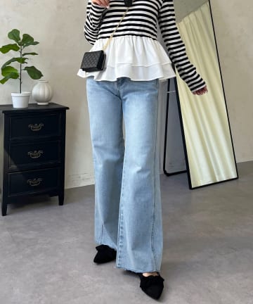 ストレッチスリット裾パールフレアデニムパンツ