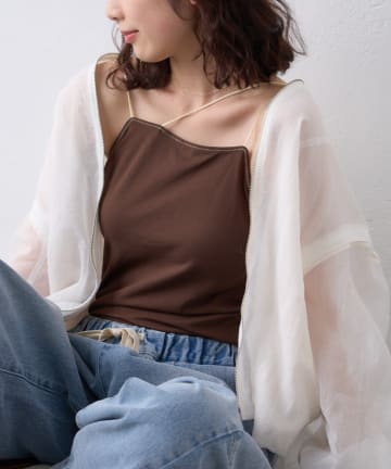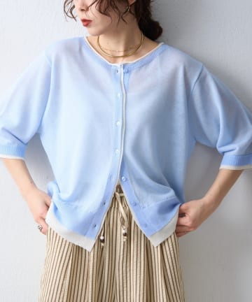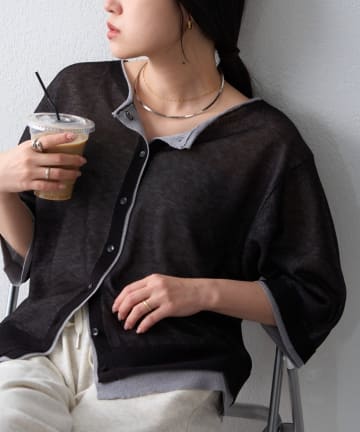 2wayレイヤードライク配色5分袖シアーニットカーデ