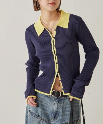 バイカラー襟付きリブナローカーデ