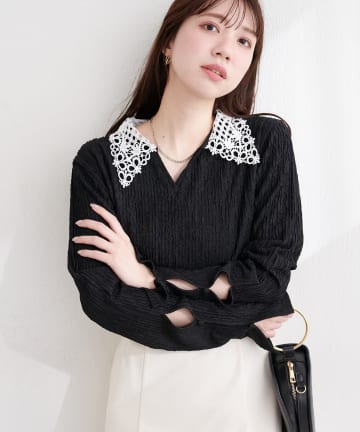 襟袖プリーツレースブラウス