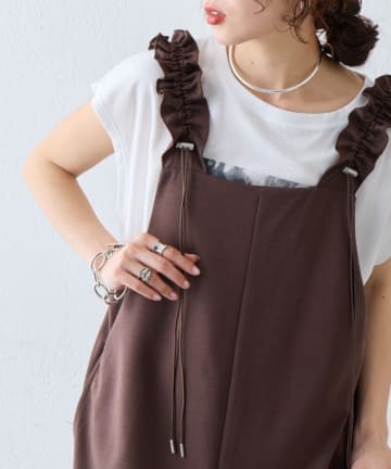 【3サイズ展開】肩ドロストギャザーカットソポンチサロペット