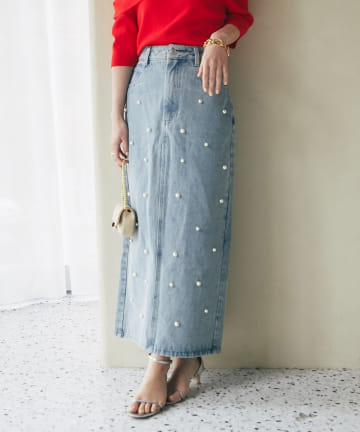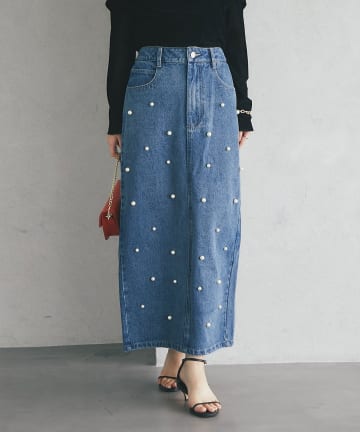 【名品・3サイズあり】パール付きデニムタイトマキシスカート