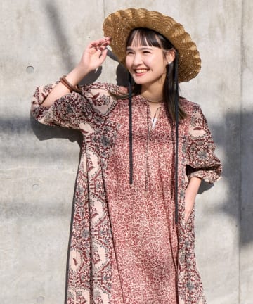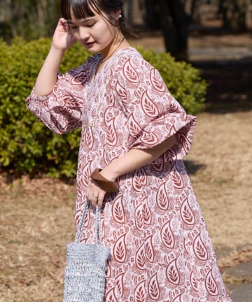 【Aguni】リーフプリントボリュームワンピース