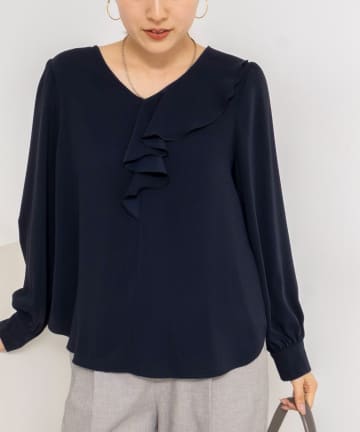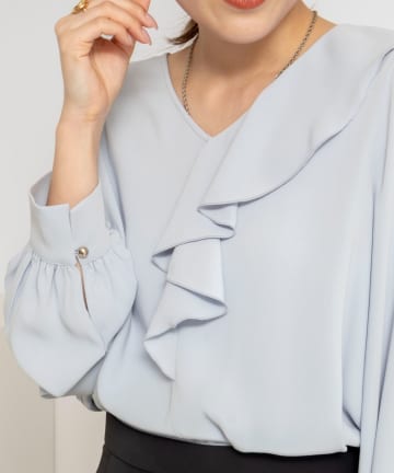 ウォッシャブルサテンアシンメトリーラッフルブラウス