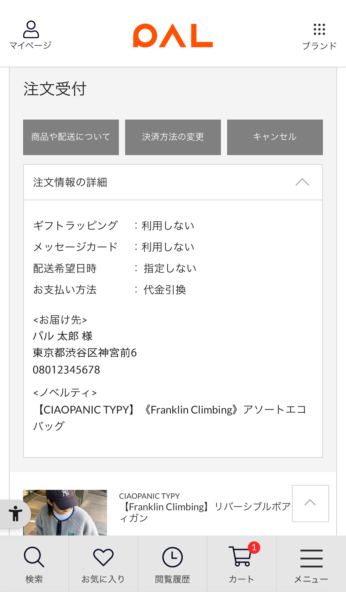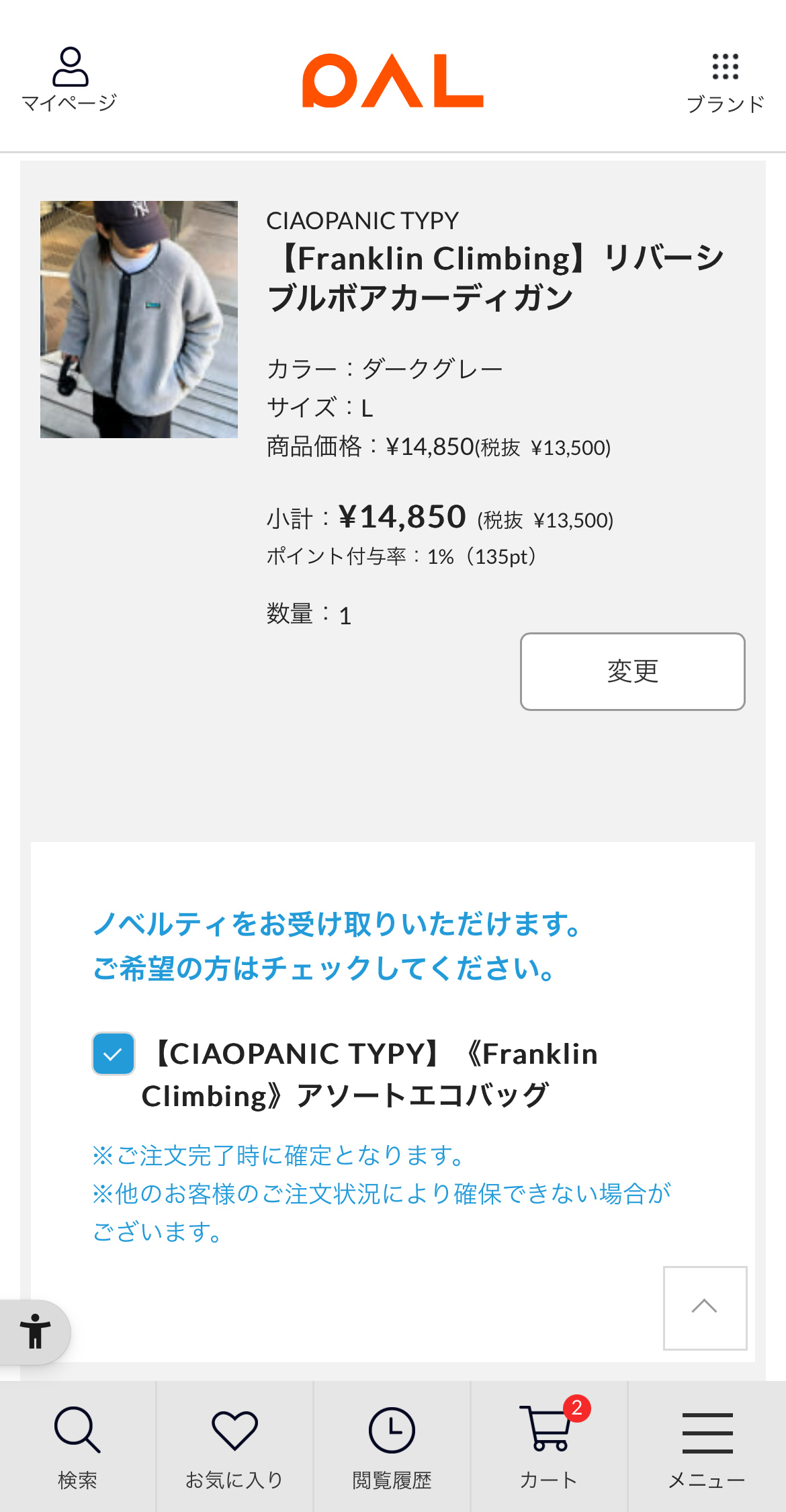 ショッピングカートに商品を入れたタイミングではノベルティについての情報は表示されません。その後のご注文内容の確認ページでご確認いただけます。また注文完了後はマイページのご注文履歴からもご確認が可能です。