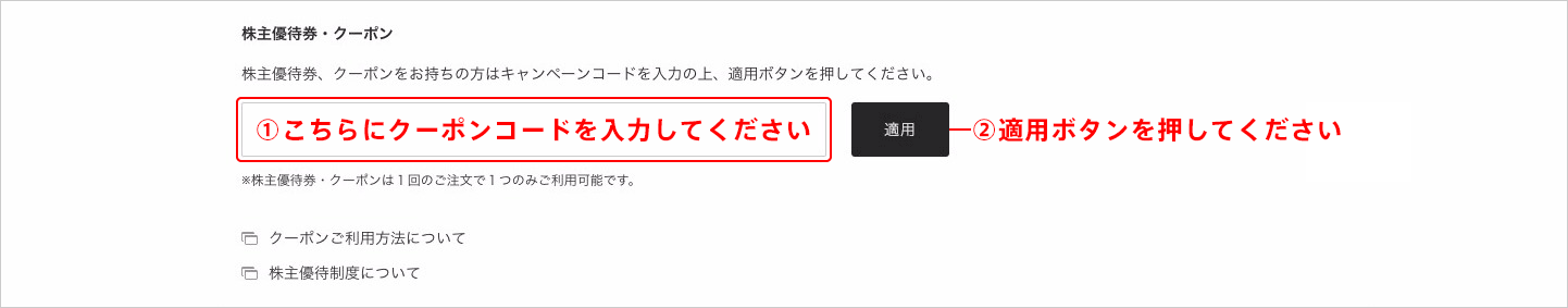 セールアイテムを2点以上カートに入れた状態でご購入手続きにお進みください。 以下の支払い方法の選択画面にて「株主優待券・クーポンのコード」入力欄にクーポンコード【2buy10p21s】を入力してください。