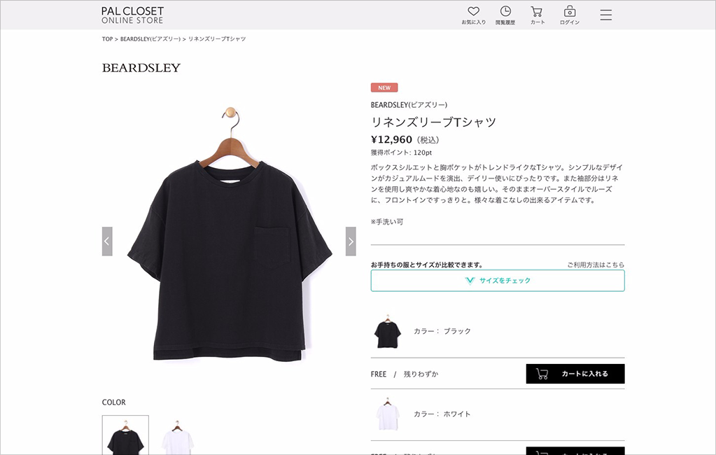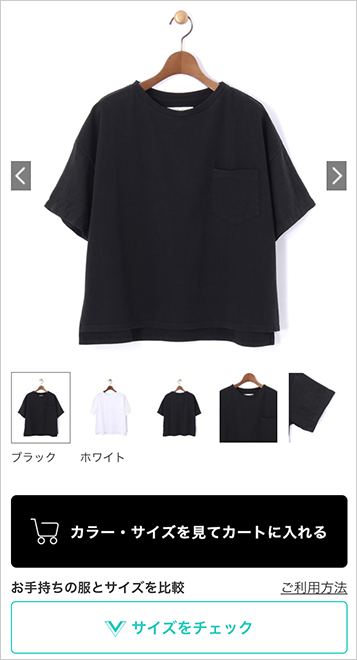 商品詳細ページに設置されている「サイズをチェック」ボタンをクリックすると、オンライン試着室が立ち上がり、見ているアイテムの画像とイラストが表示されます。