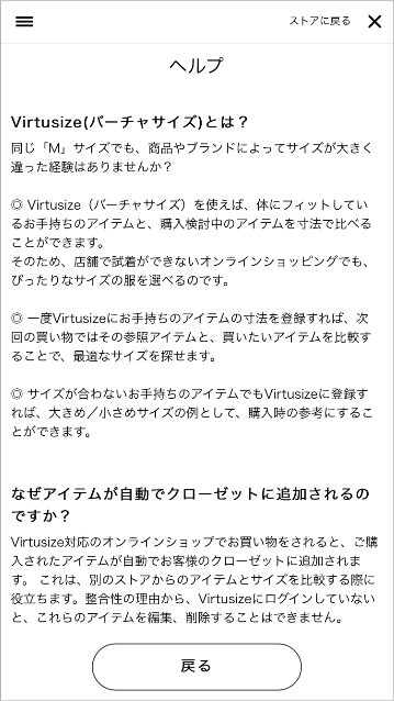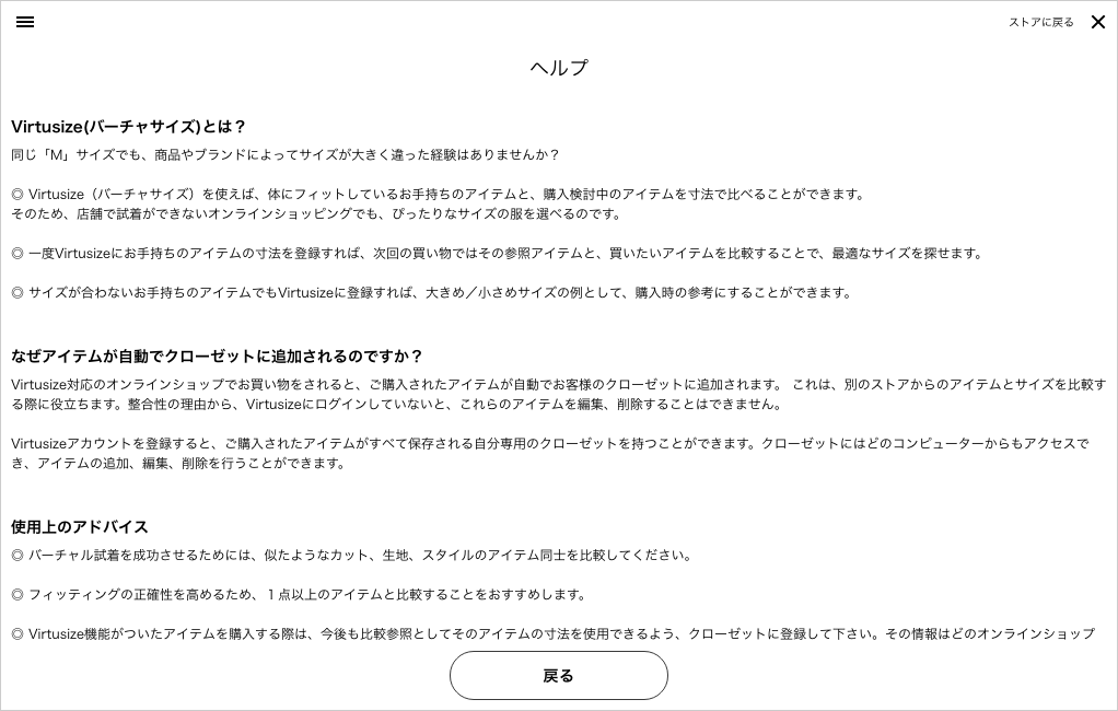 バーチャサイズの利用方法やよくある質問をご確認頂くには、画面左上のメニューバーから「ヘルプ」をクリックしてください。