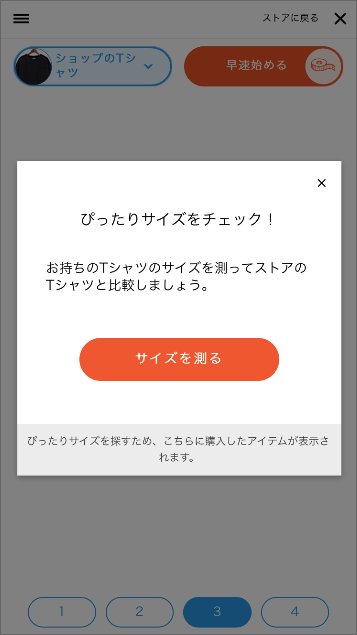 まだ購入履歴のないお客様には、Virtusizeの使い方が案内されます。「早速始める」ボタンを押した後、「サイズを測る」ボタンを押して採寸を始めましょう。