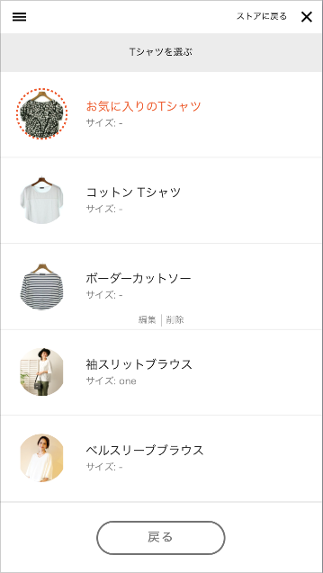 画面左上のメニューバーを開き「マイクローゼット」をクリックすると、お客様の購入履歴や採寸したアイテムが表示されます。「編集」メニューから、アイテムの情報を編集することができます。