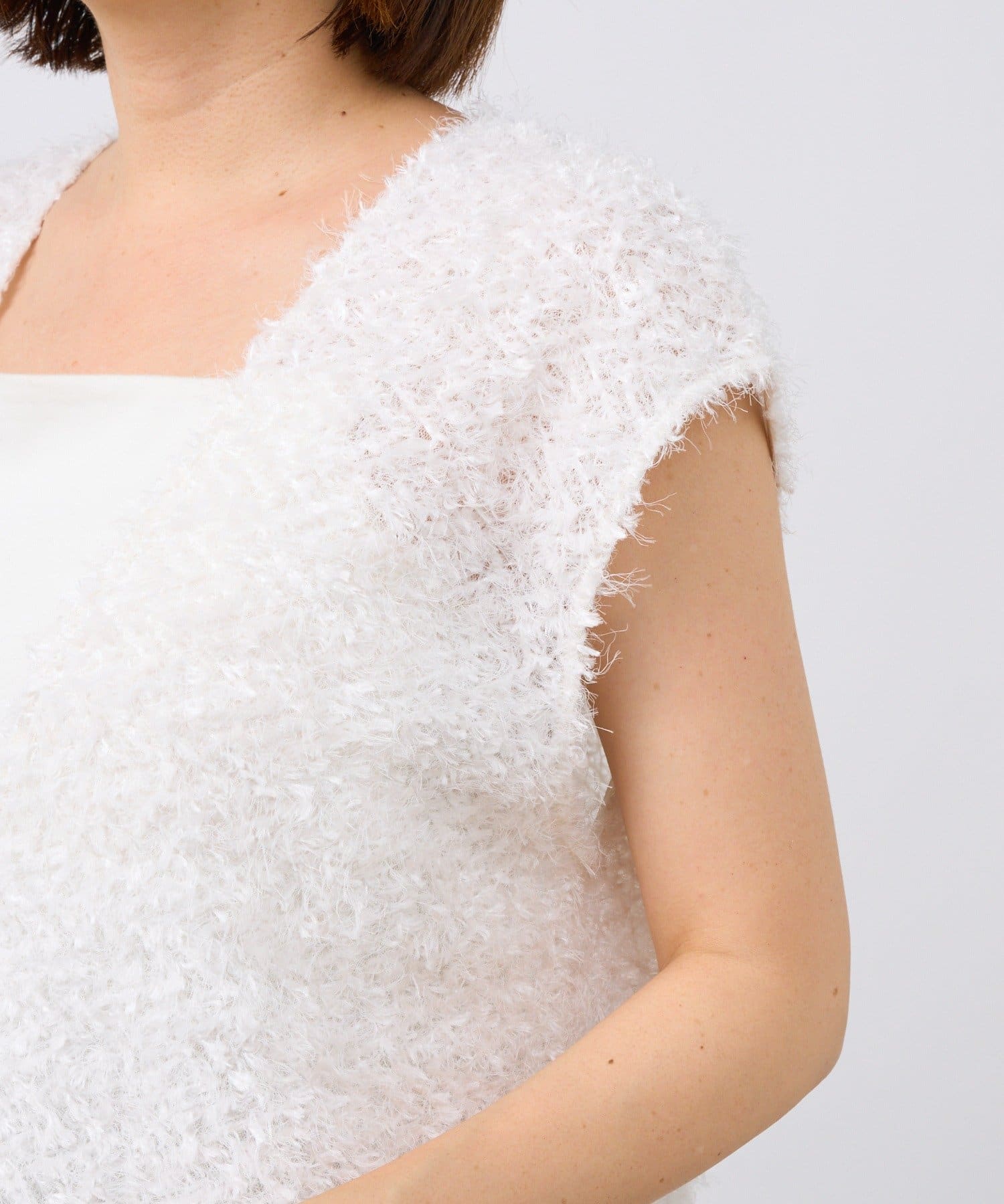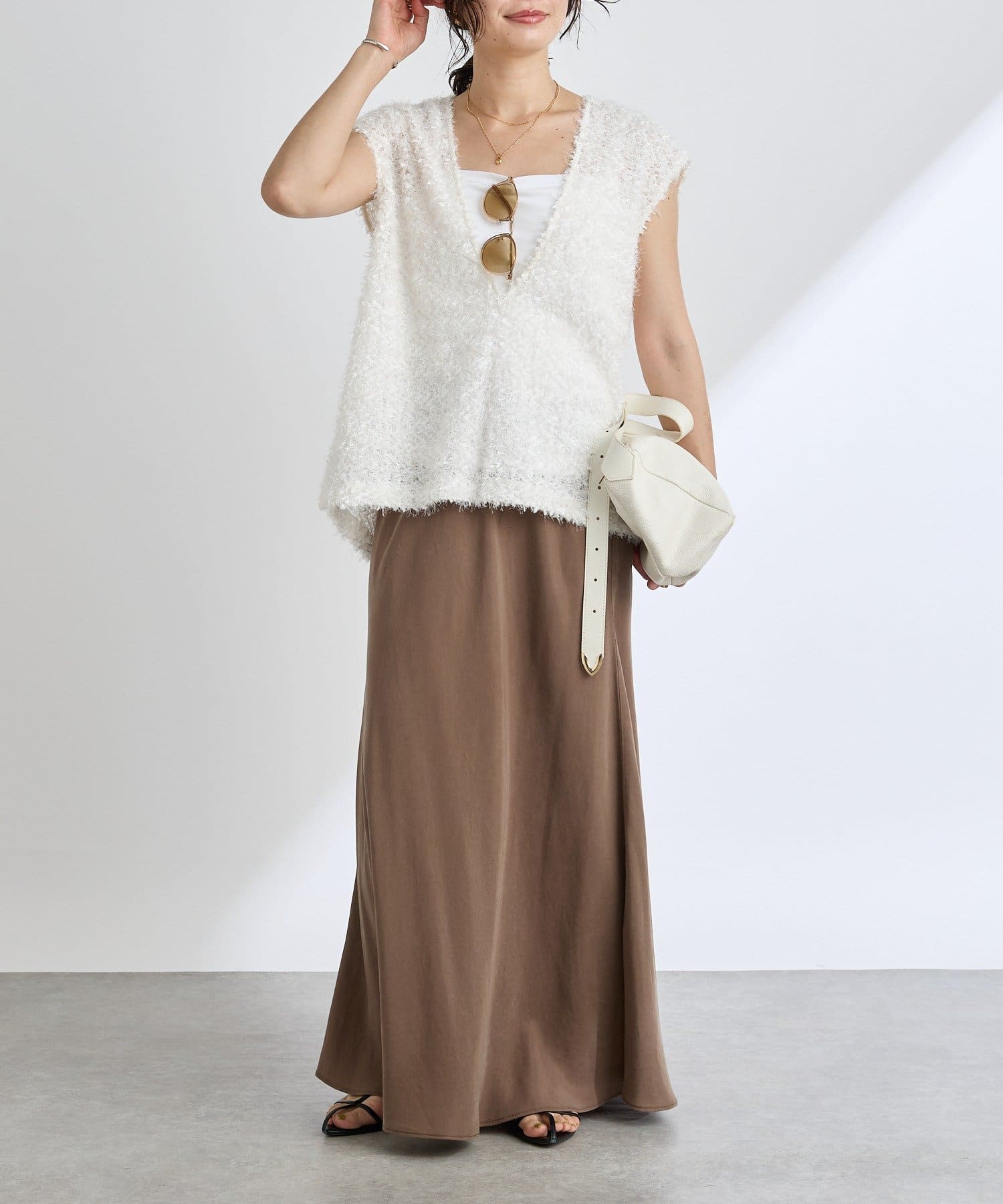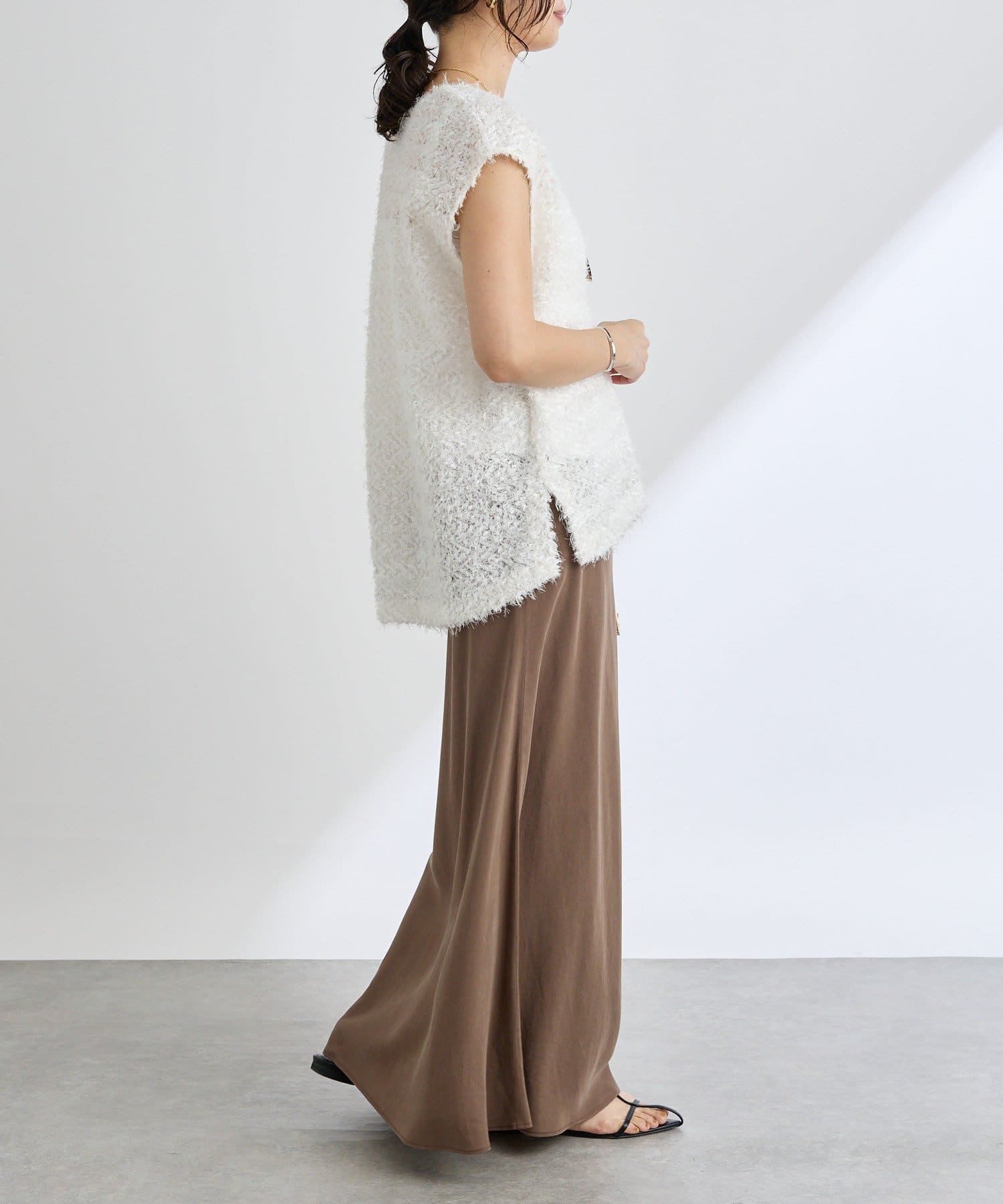 ソフトで華やかな表情をもつ素材が、着るだけで主役顔になる一枚です。