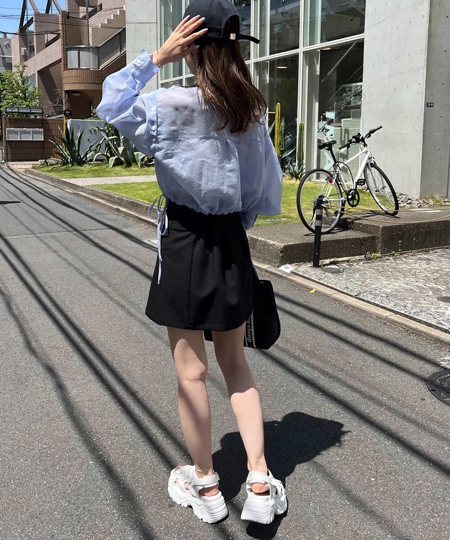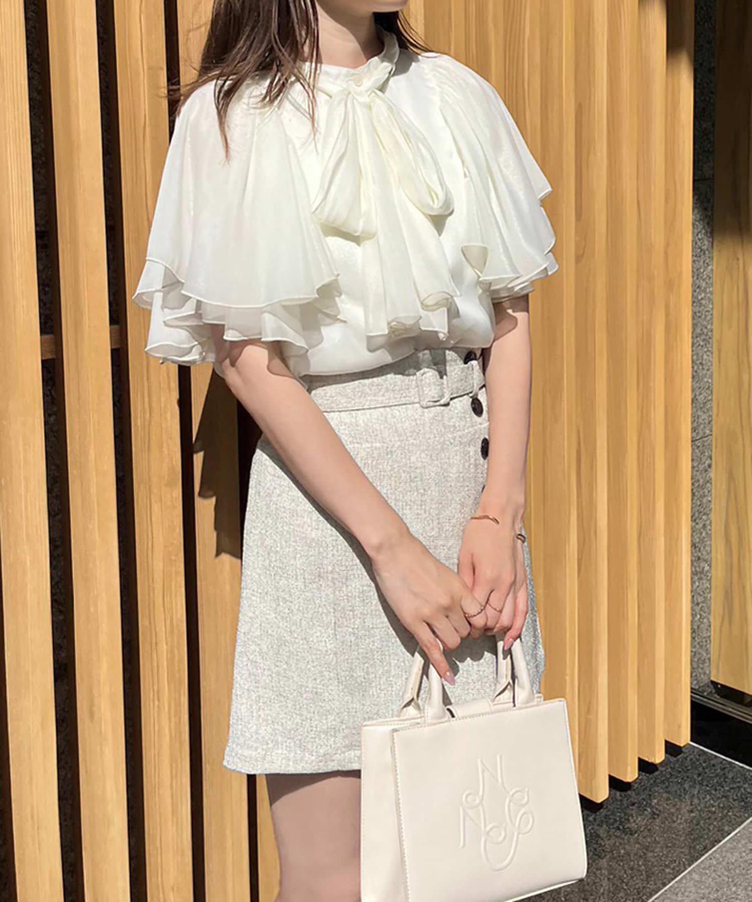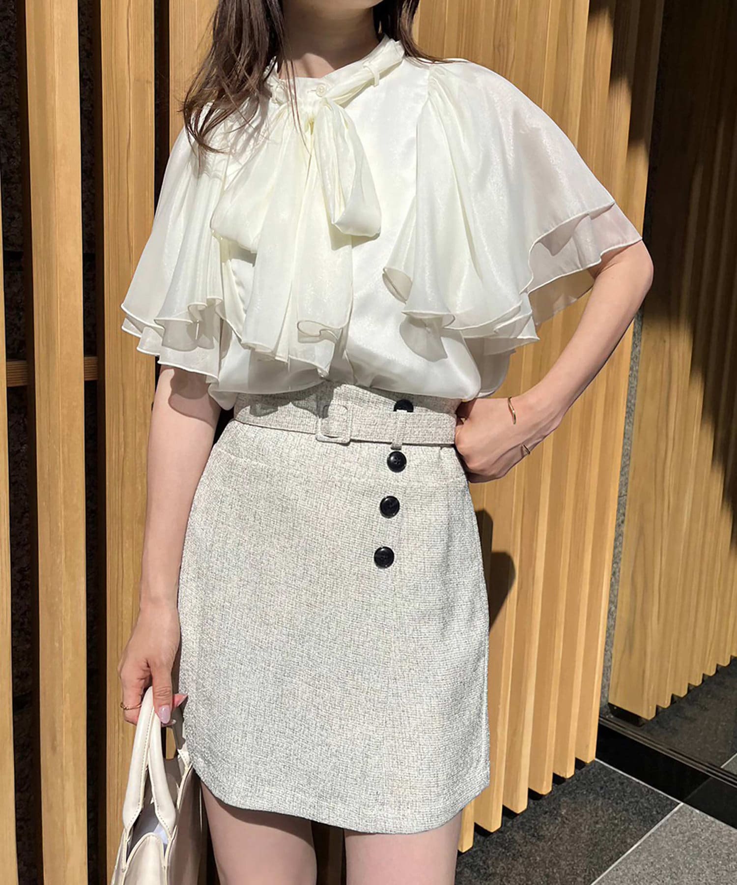 コンパクトなバッグと合わせるとよりこなれたスタイリングになります。