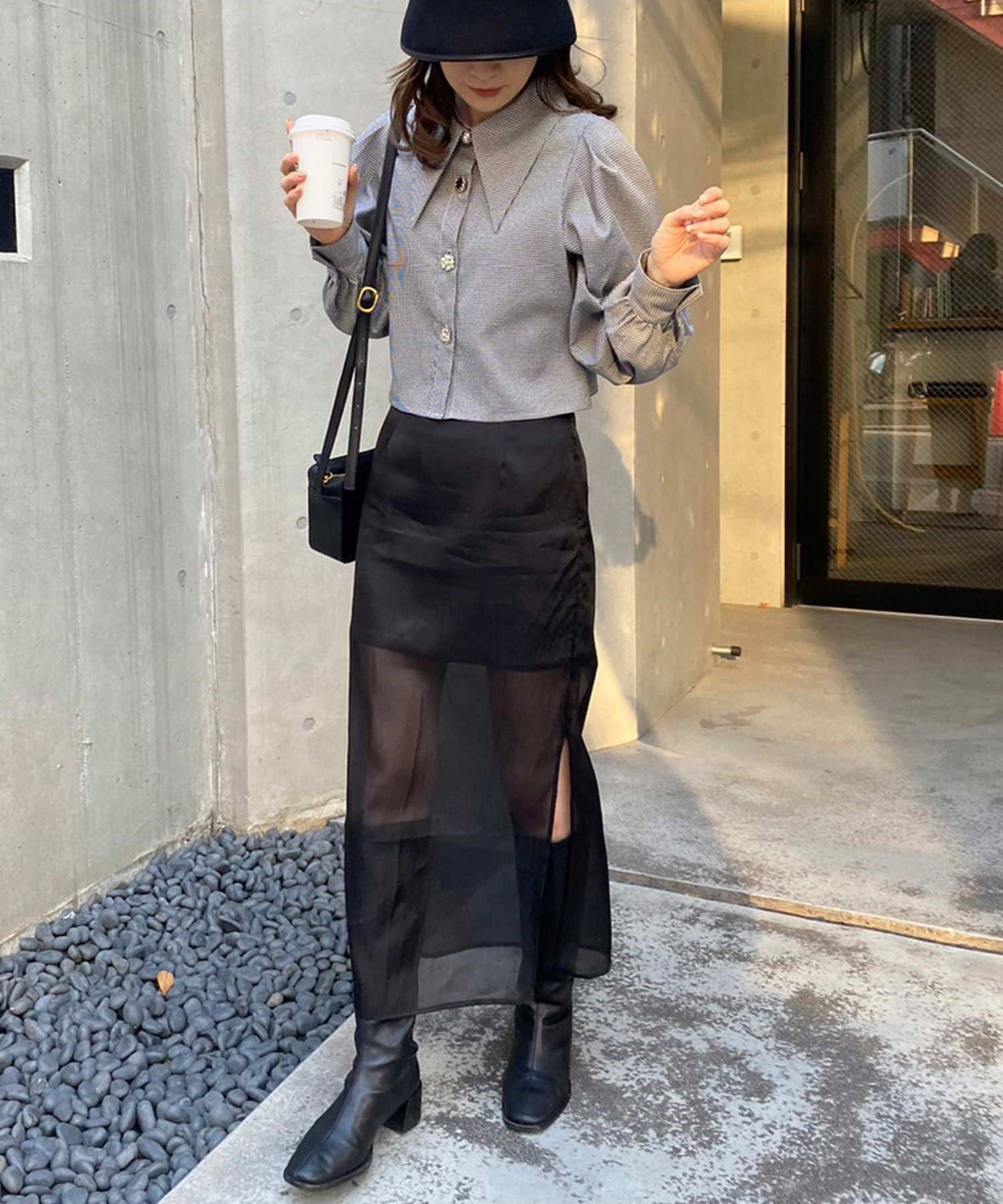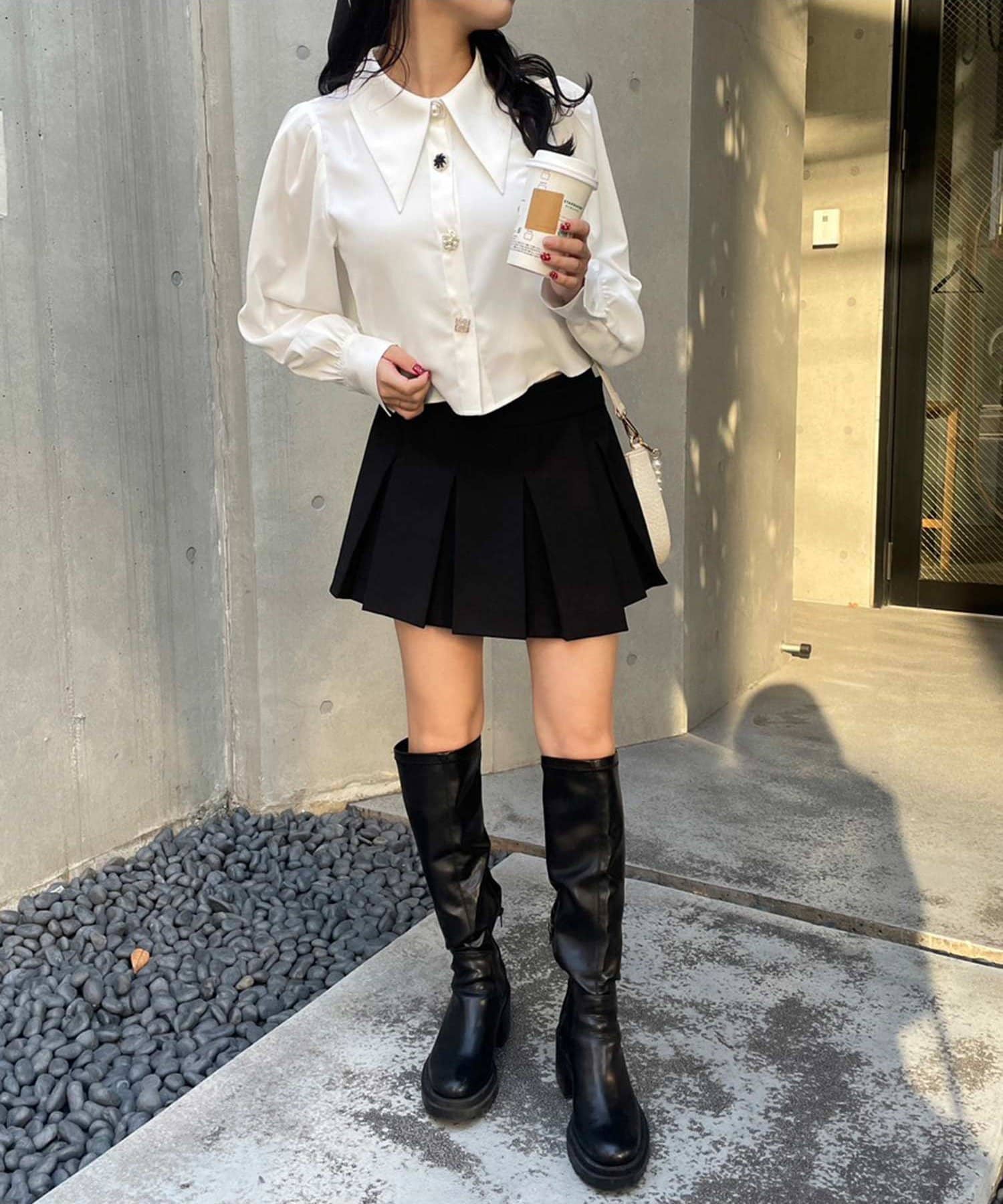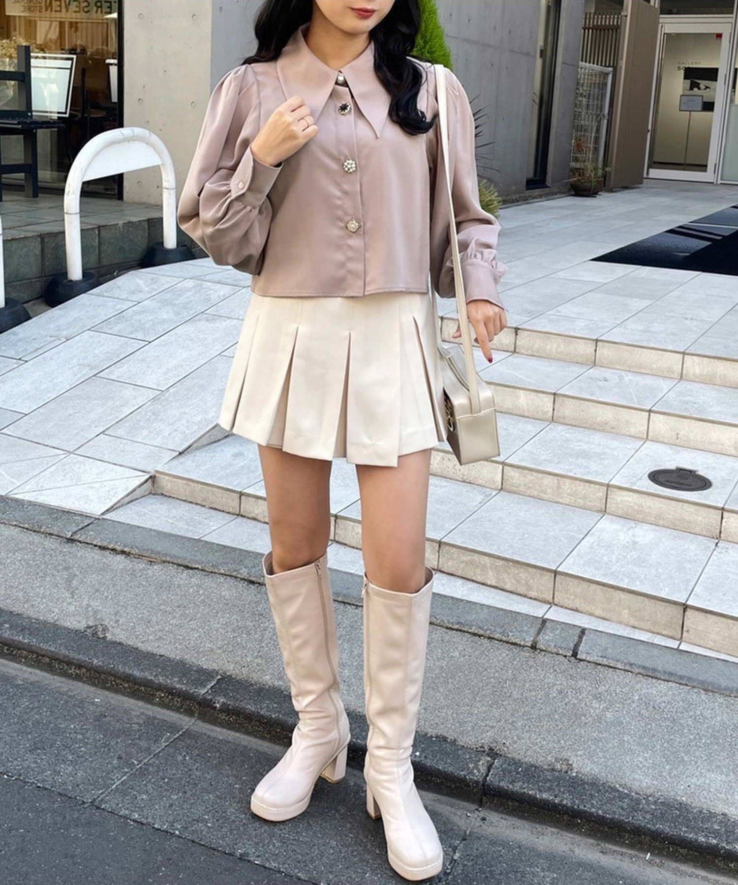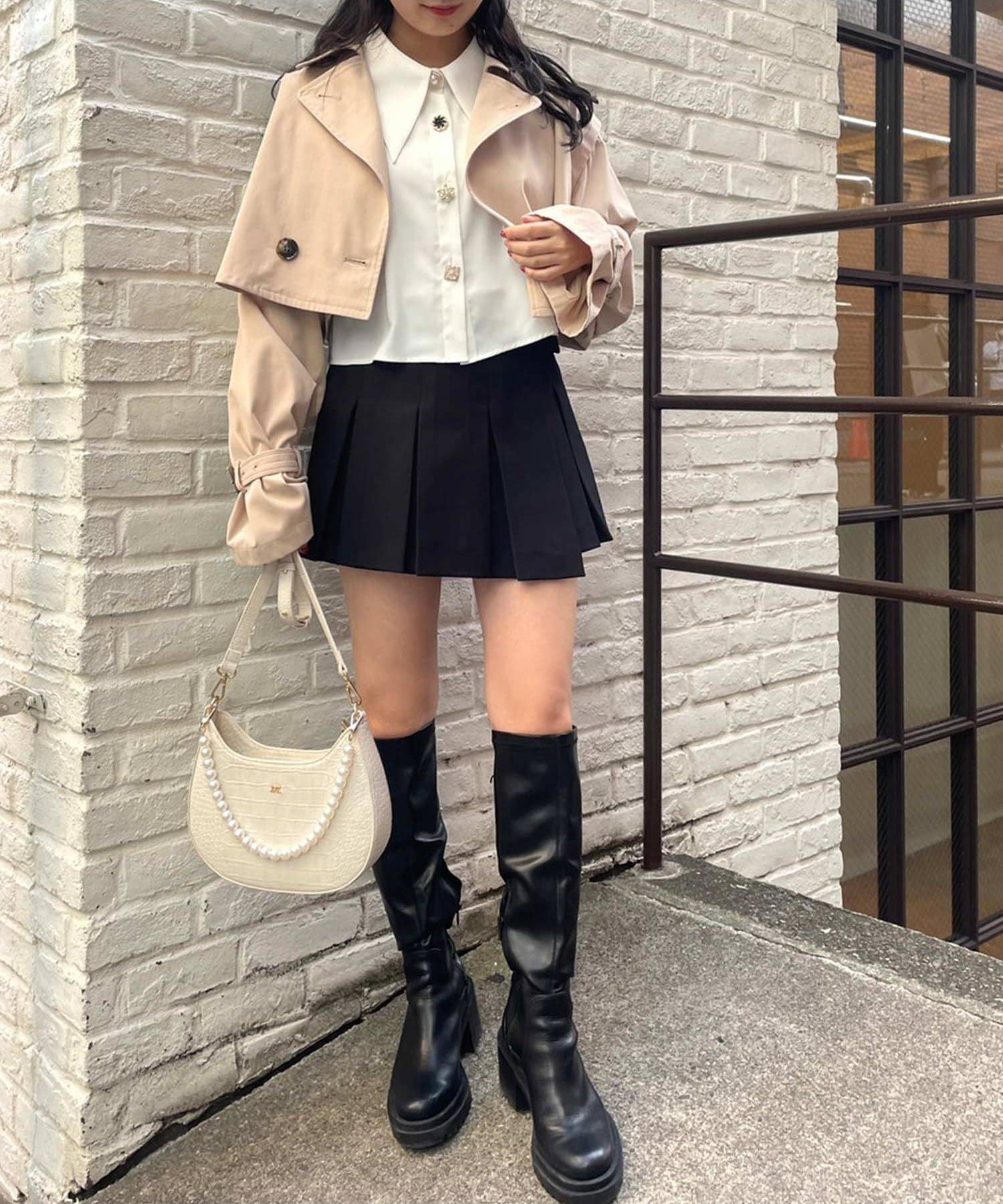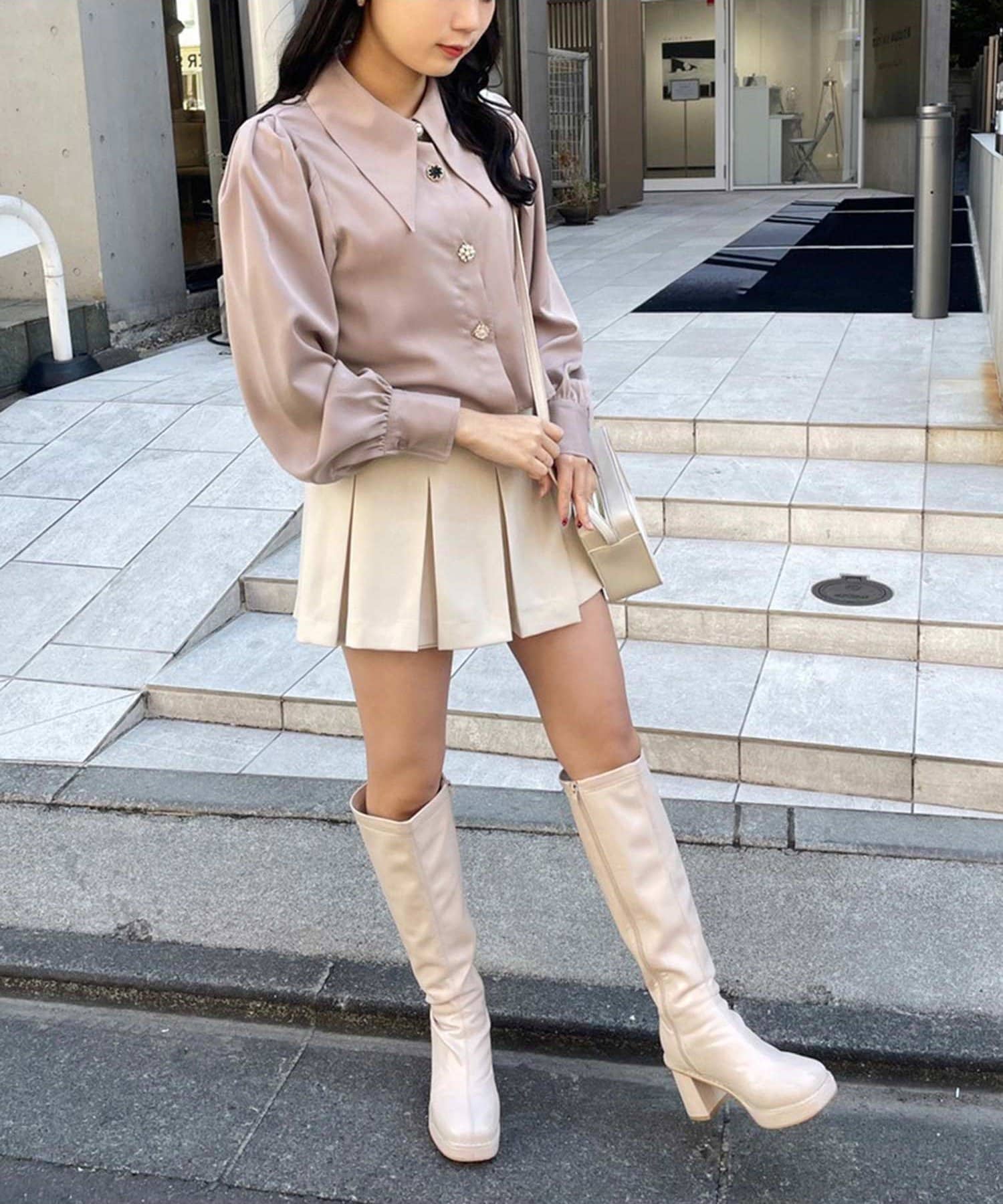 王道甘めのスタイリングがお好きな方は、ミニボトムにブーツ合わせがオススメ。