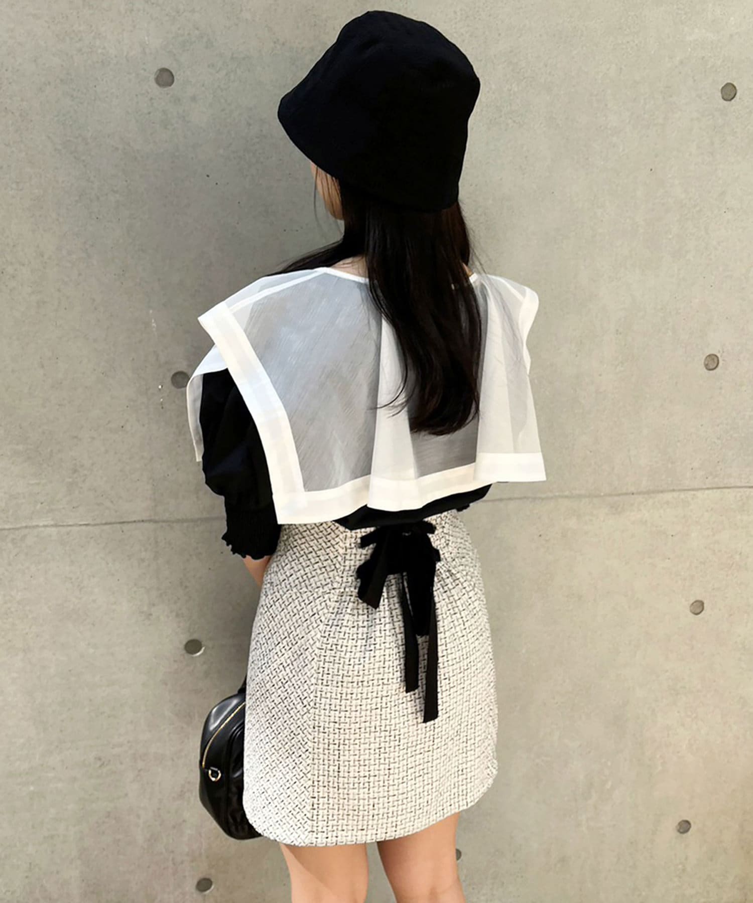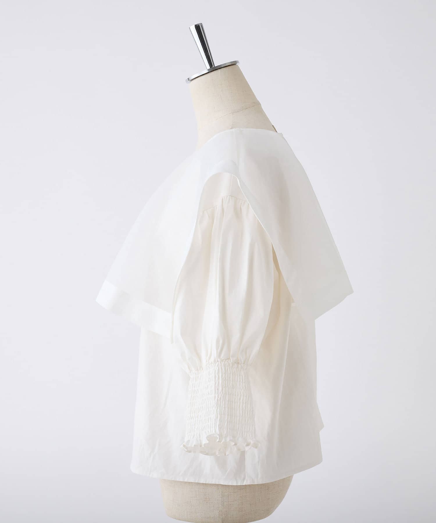 思わず目を引く大きめのセーラー襟のデザインと異素材がポイント。