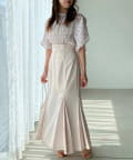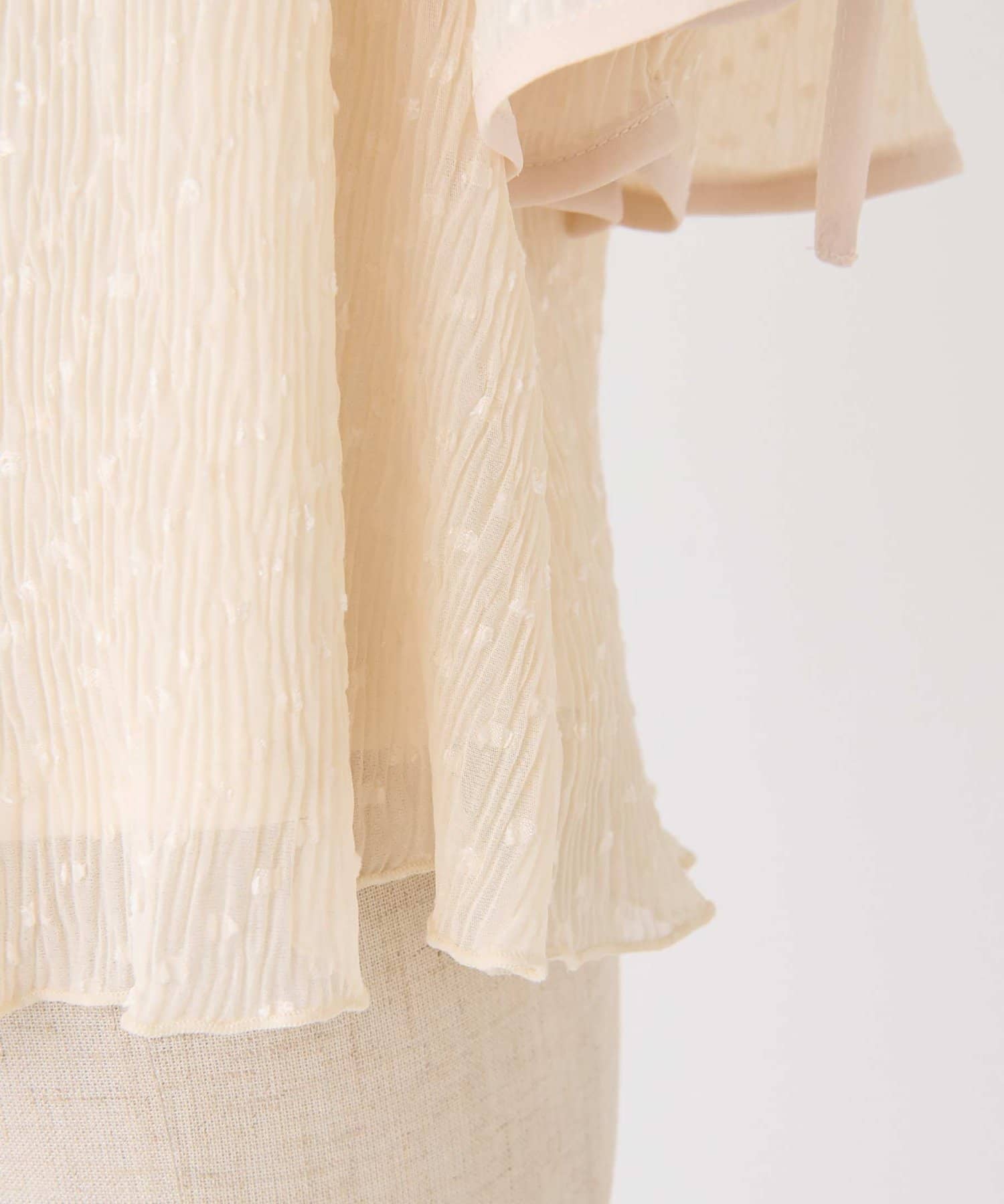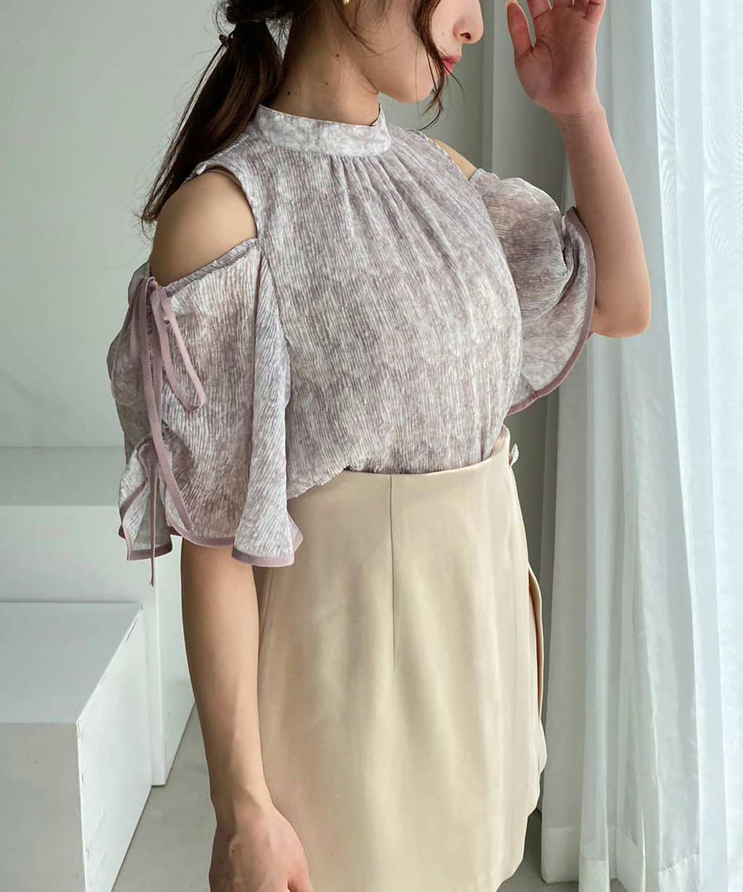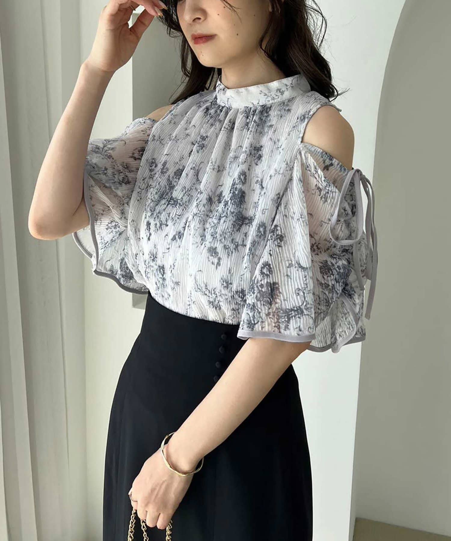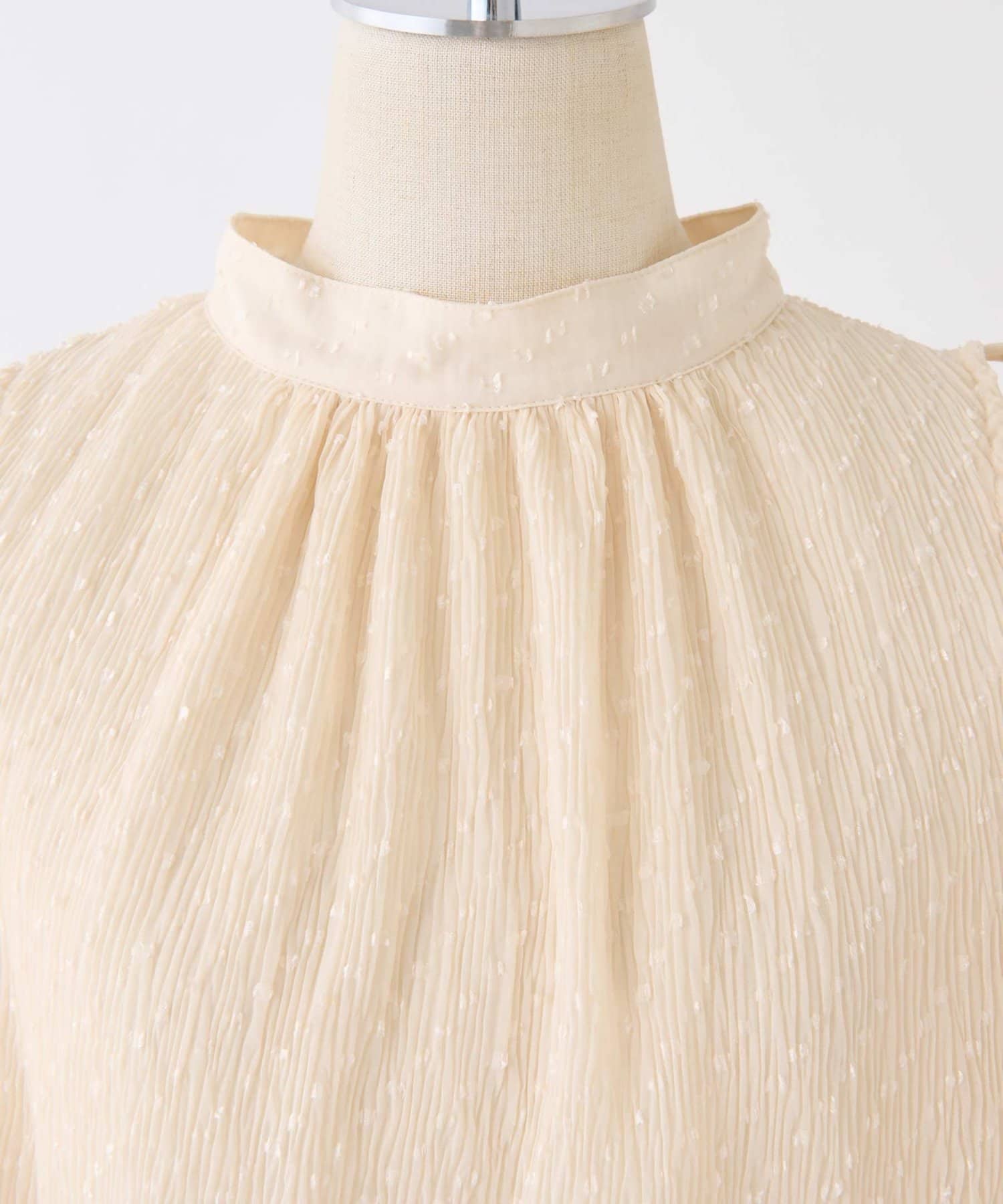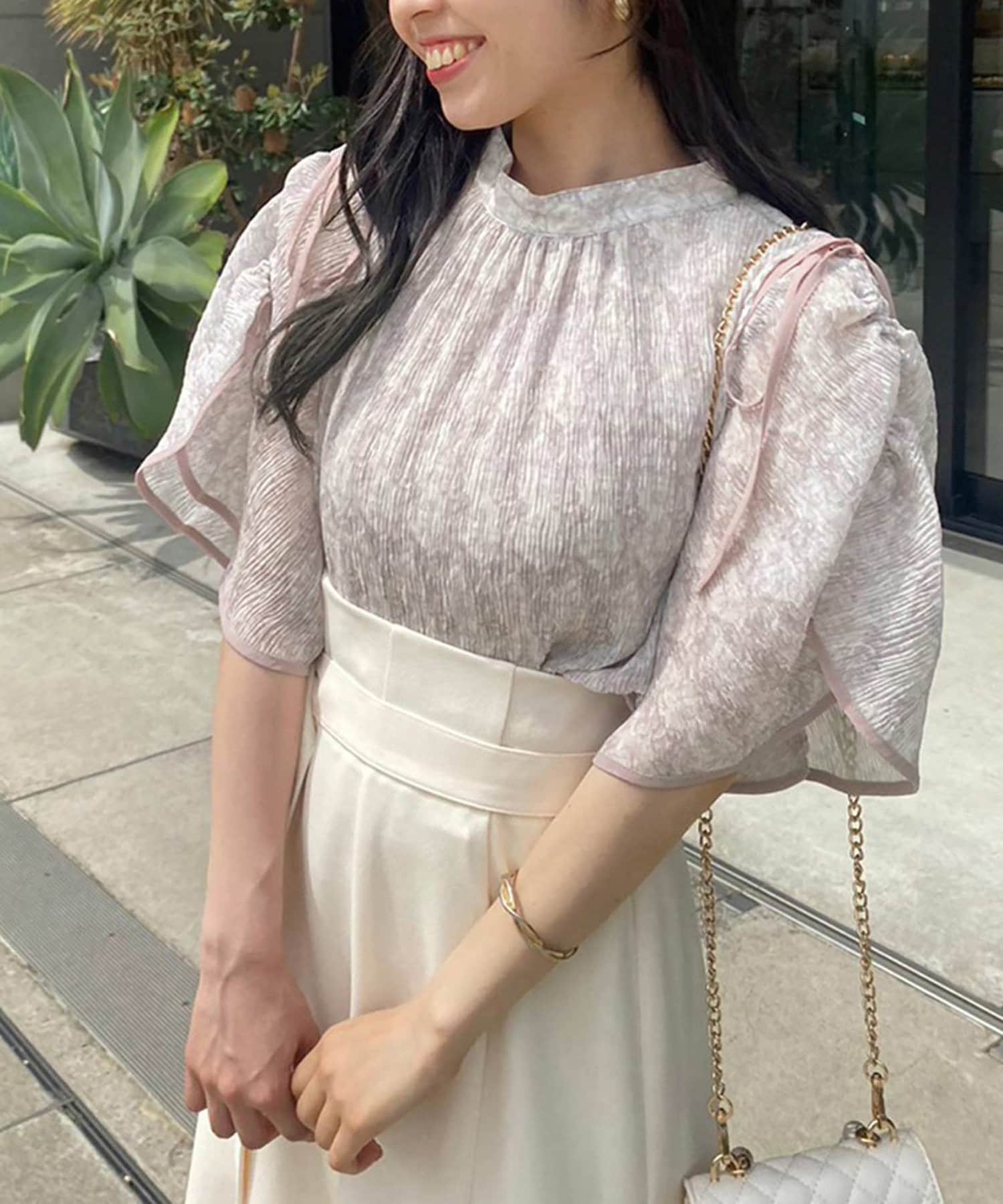 素材はとろみ感のある柔らかな素材にプリーツ加工をあしらい華やかな印象に。