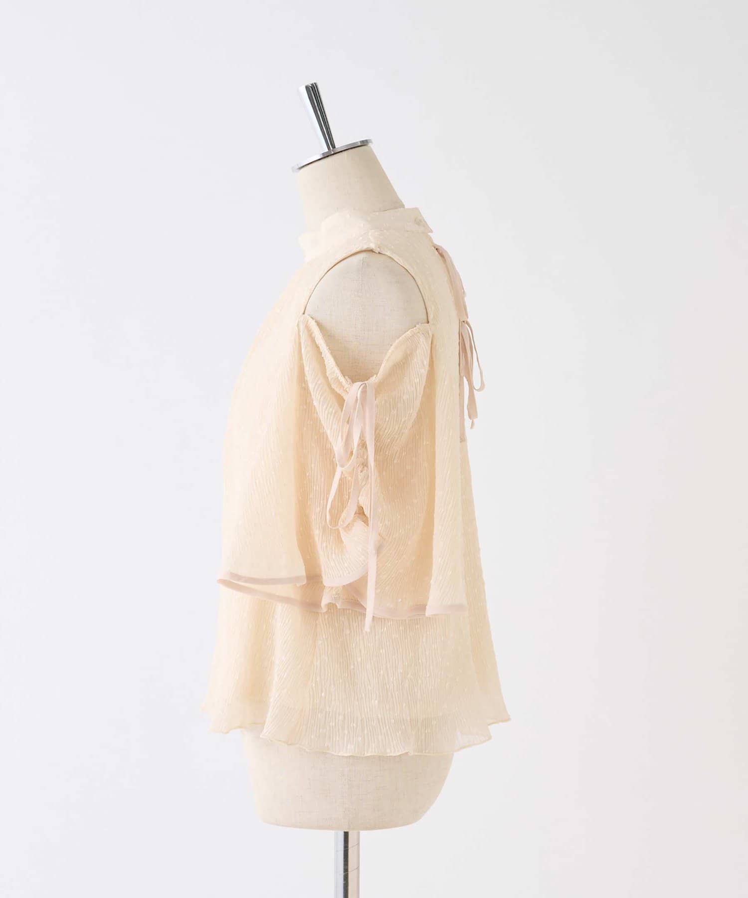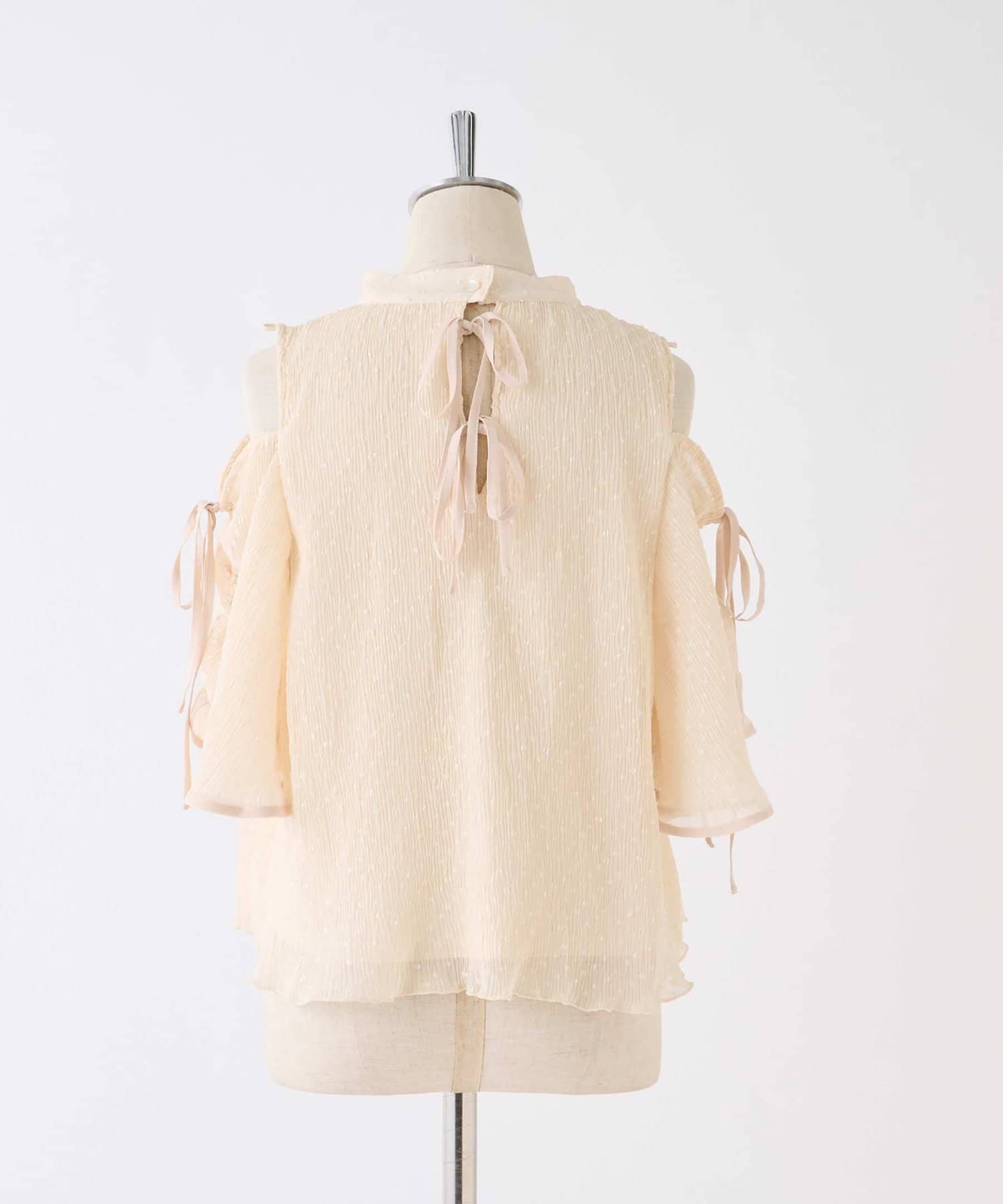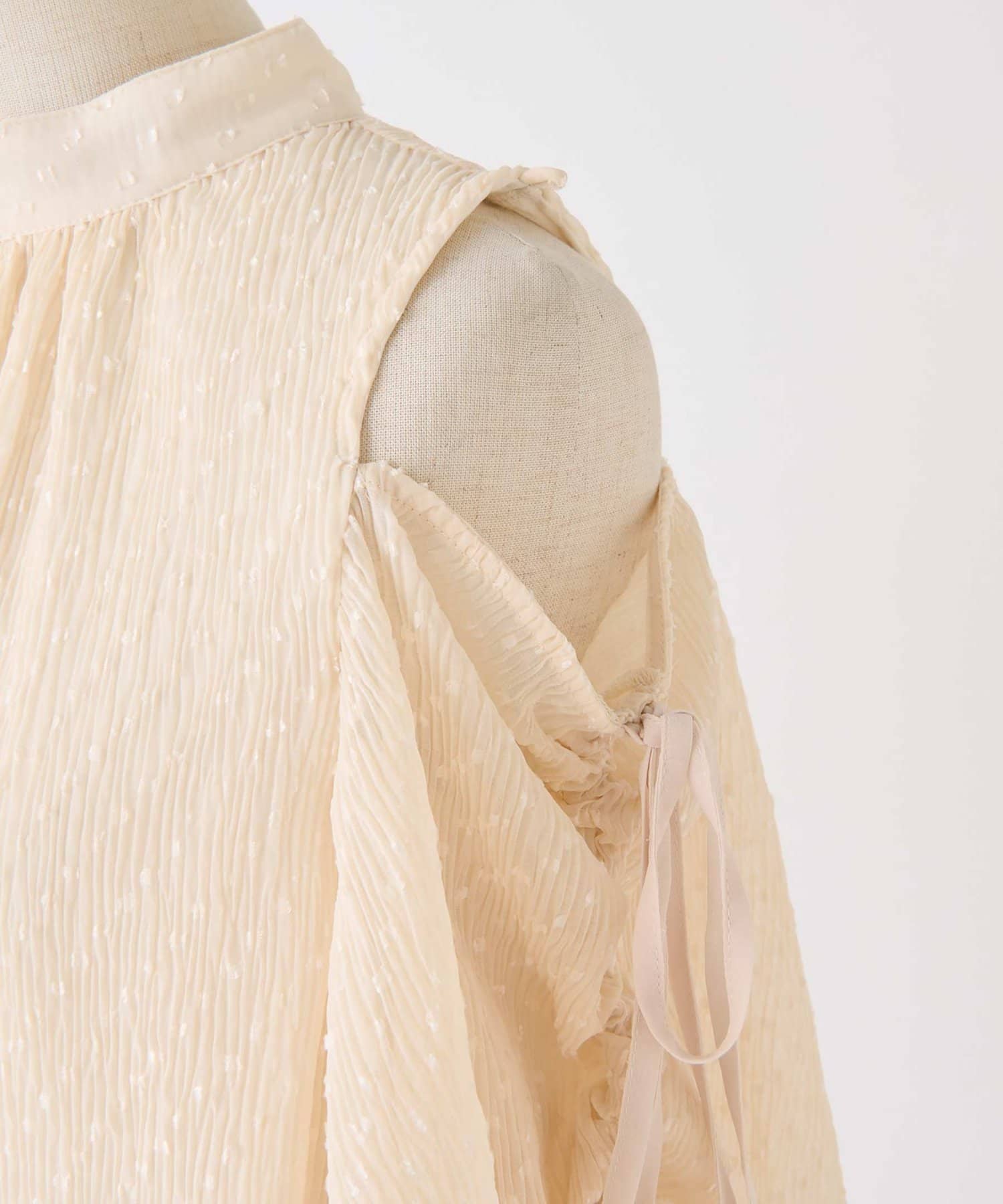 袖に紐は通しているので、肩リボンを絞って結ぶことで、肩の開き具合を調節可能。