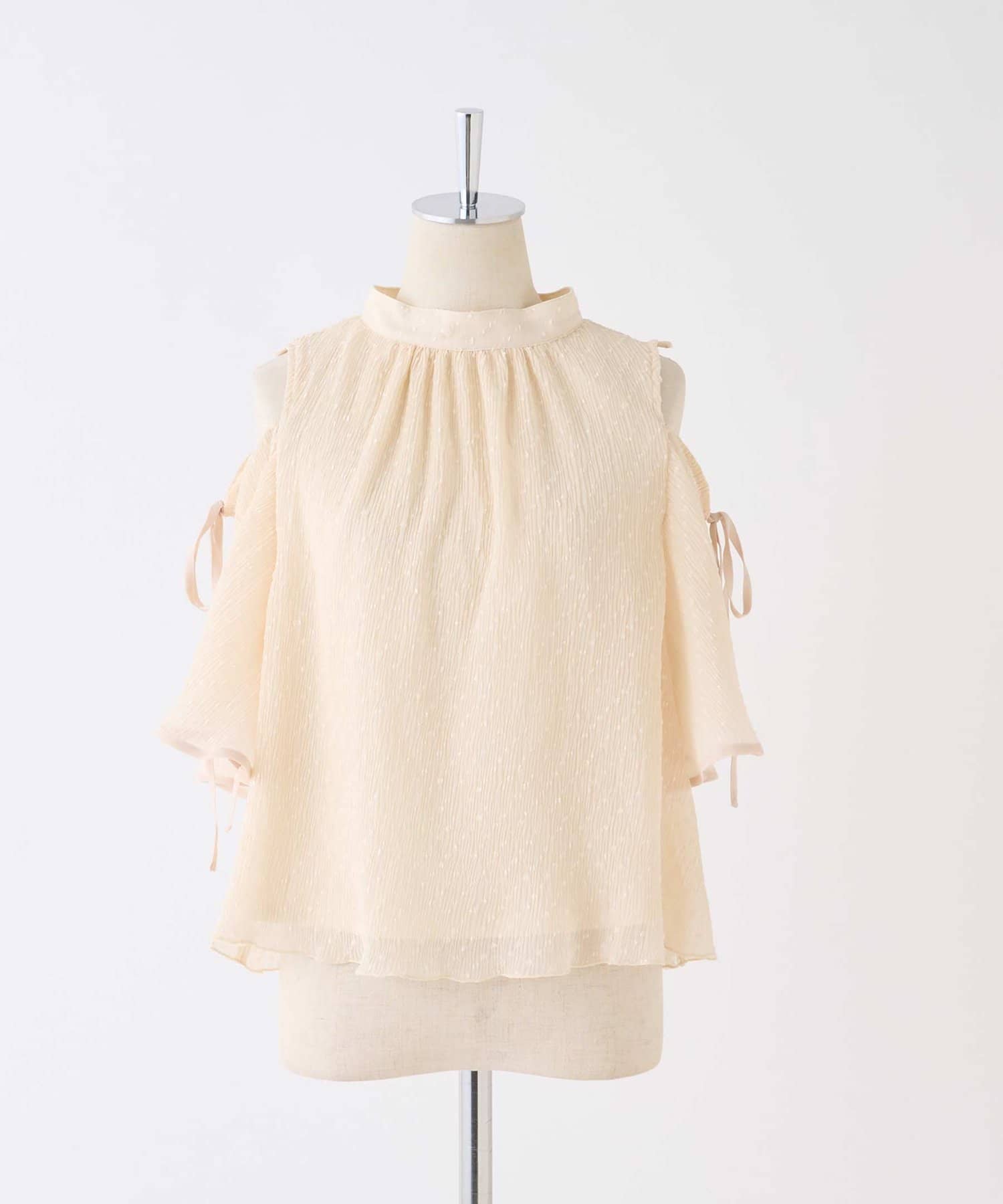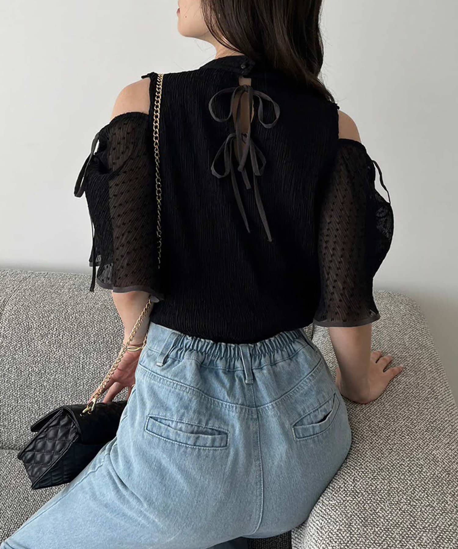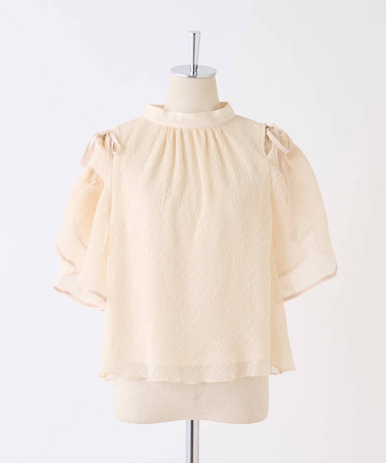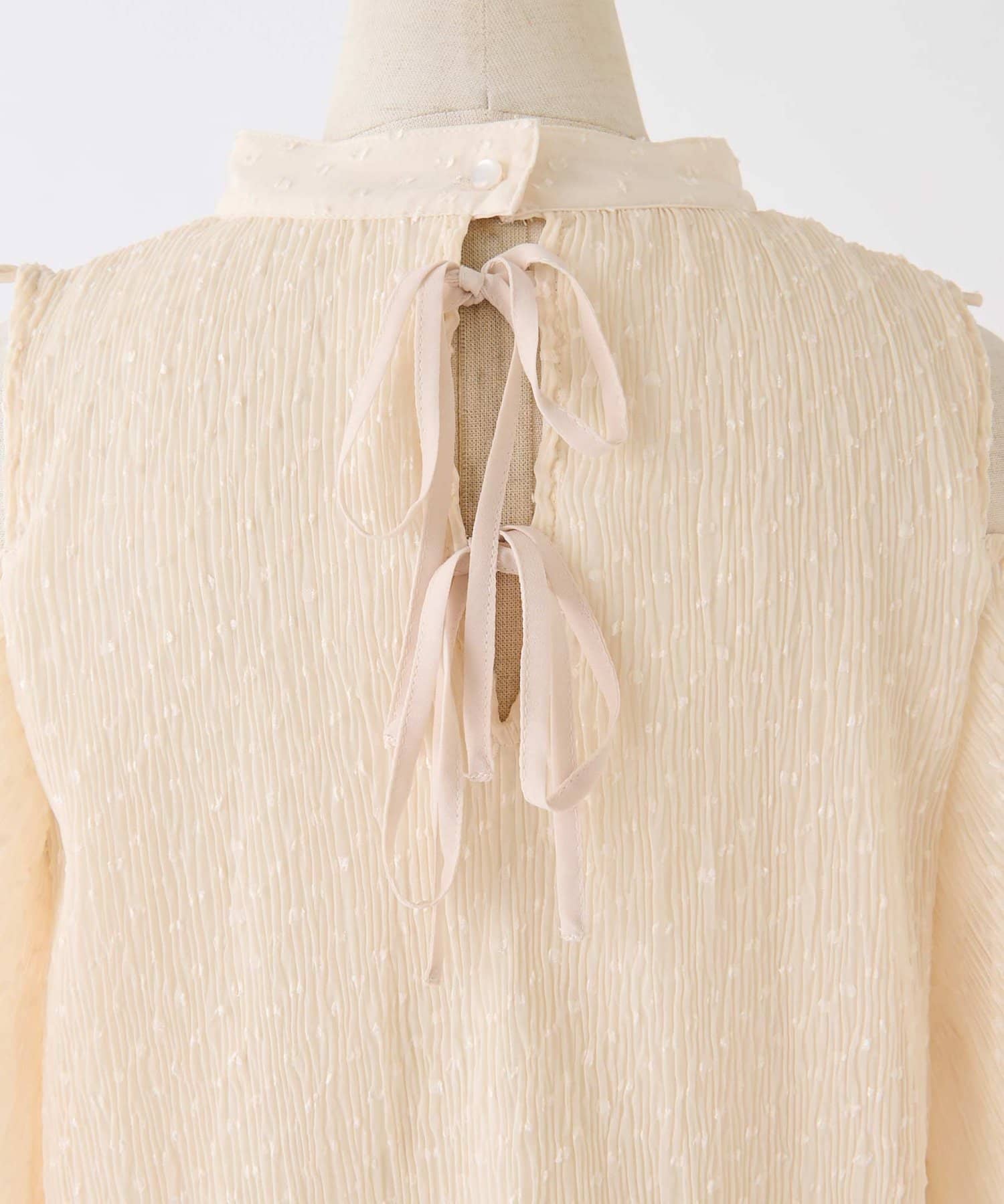 袖に紐は通しているので、肩リボンを絞って結ぶことで、肩の開き具合を調節可能。