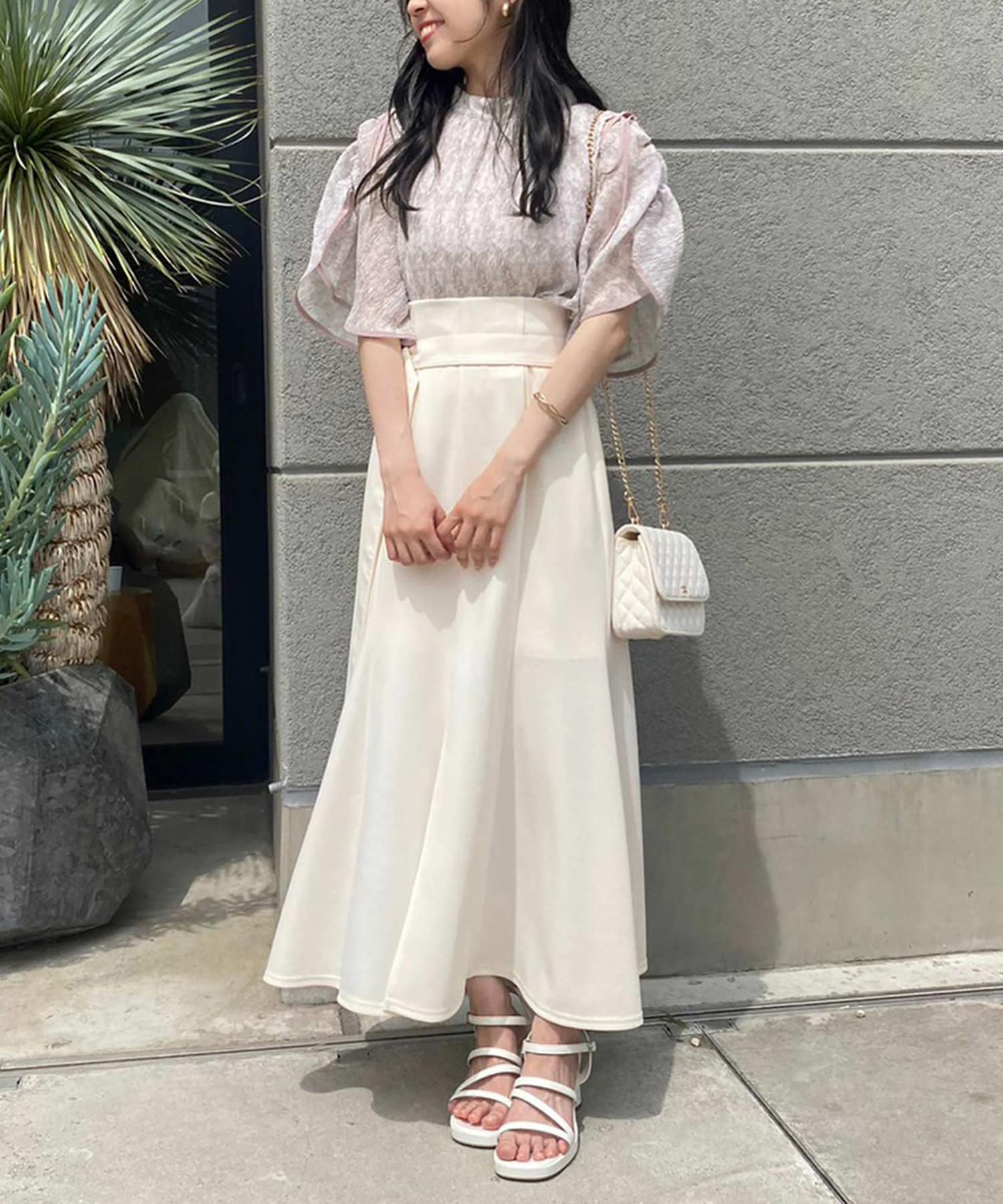 上品な印象になるブラウスなので、ロングボトムとの相性は◎