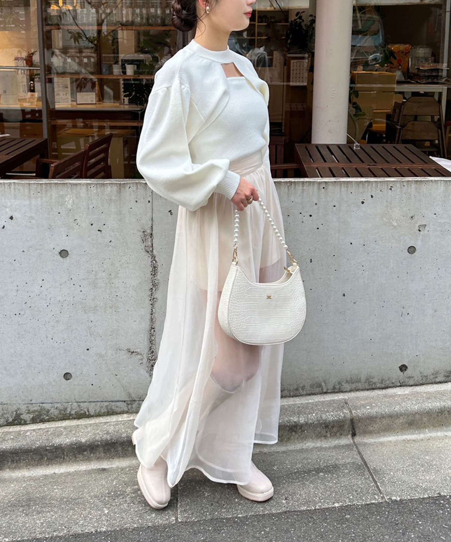 トップスはトレンドの肌見せスタイルが胸あきのデザインと、