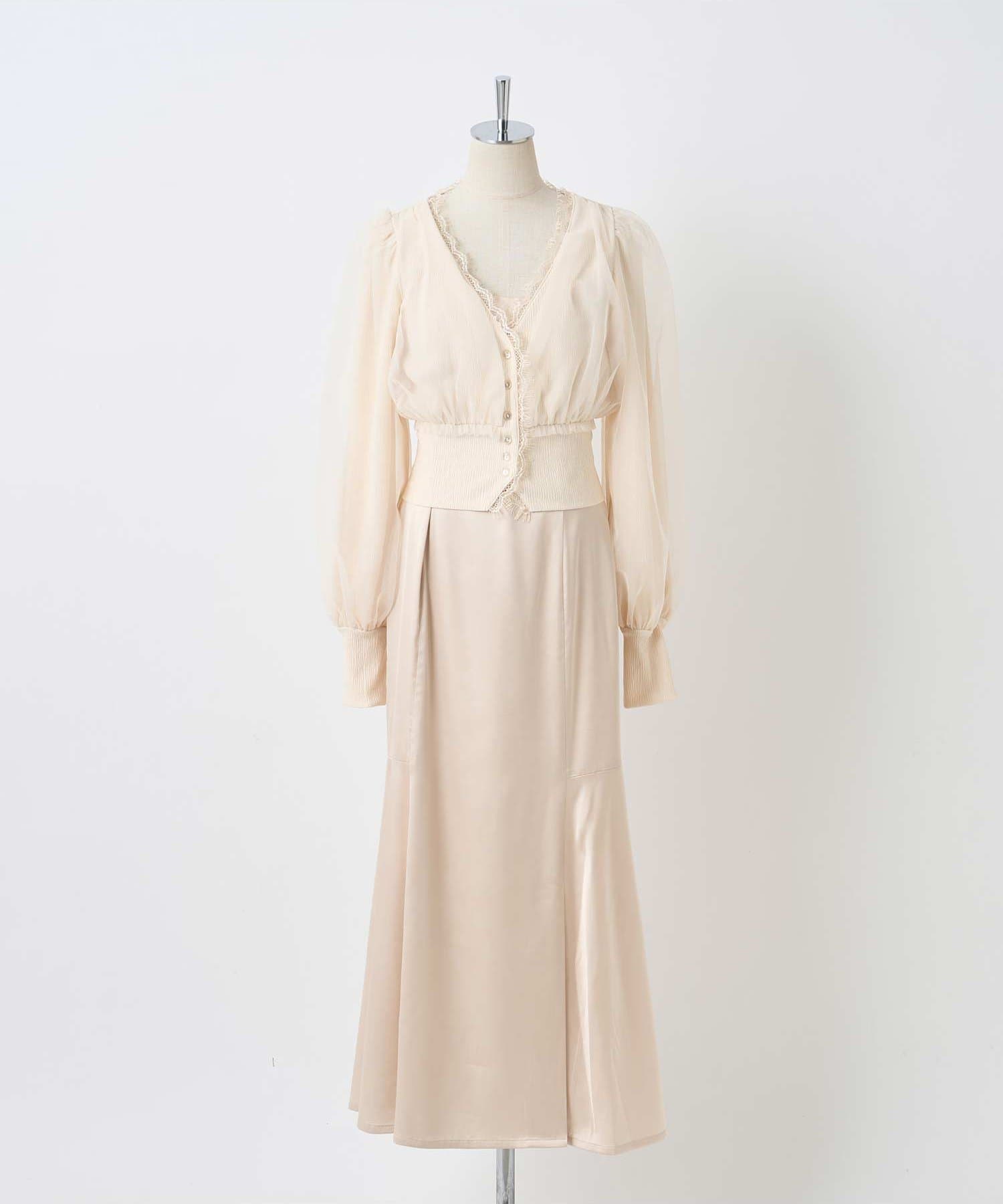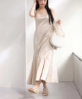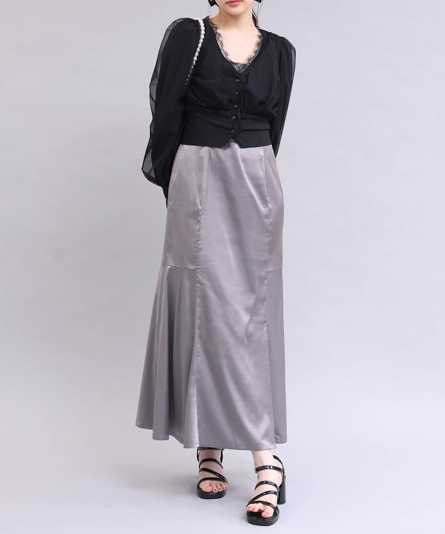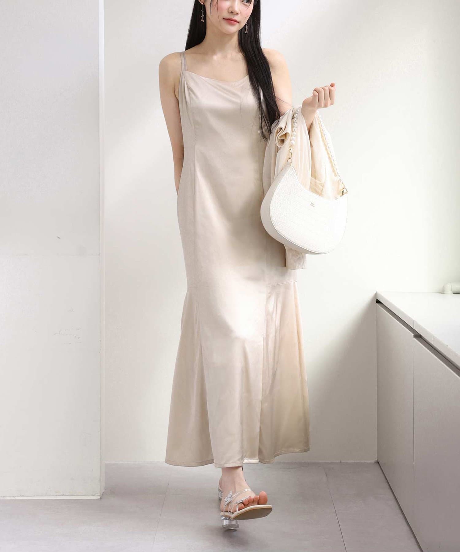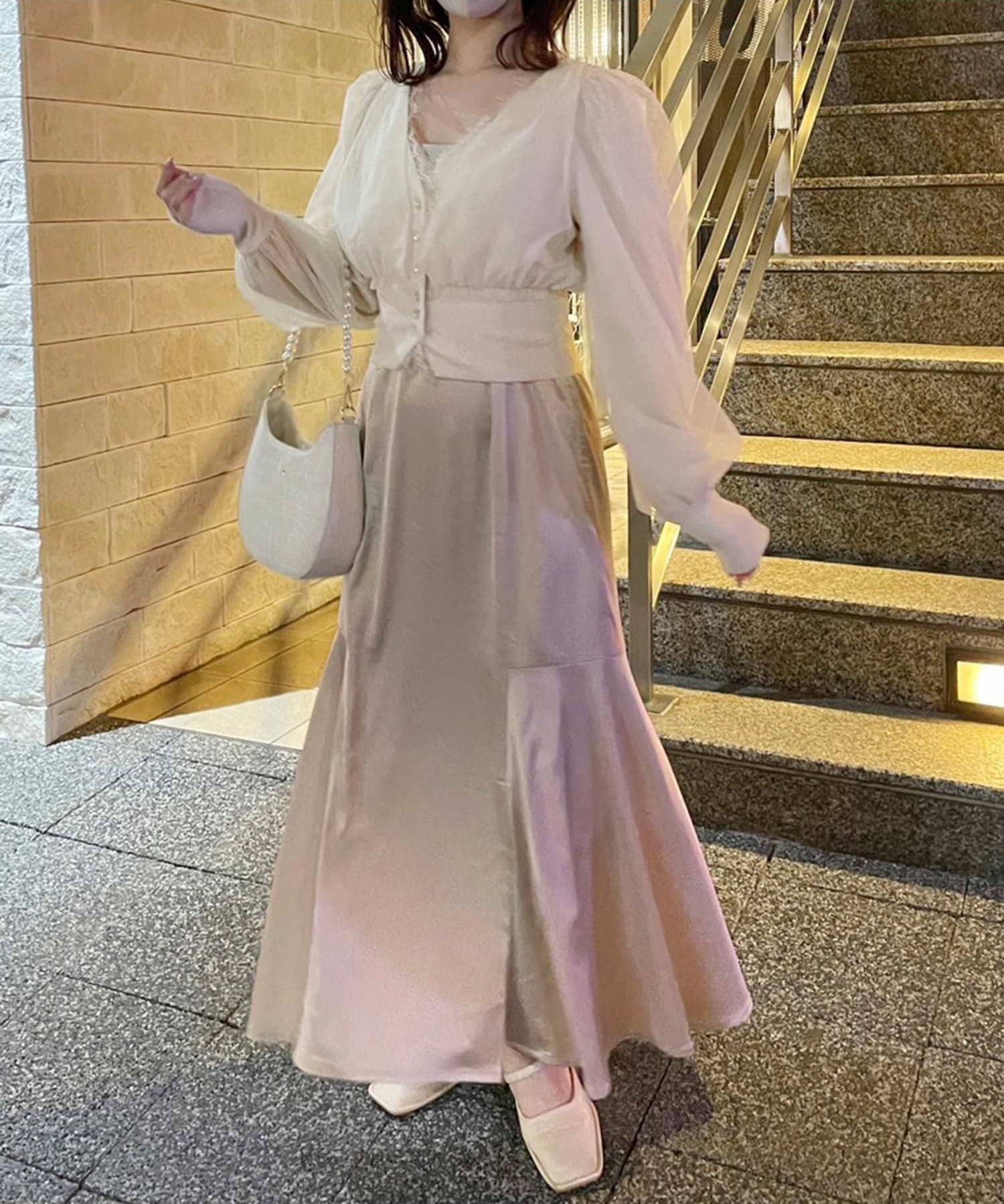サテン生地のキャミワンピと透け感のあるトップスのセットで着るのはもちろん、