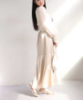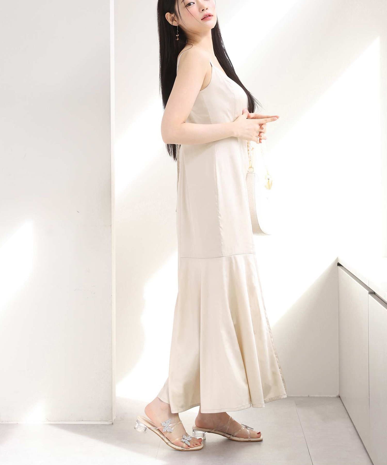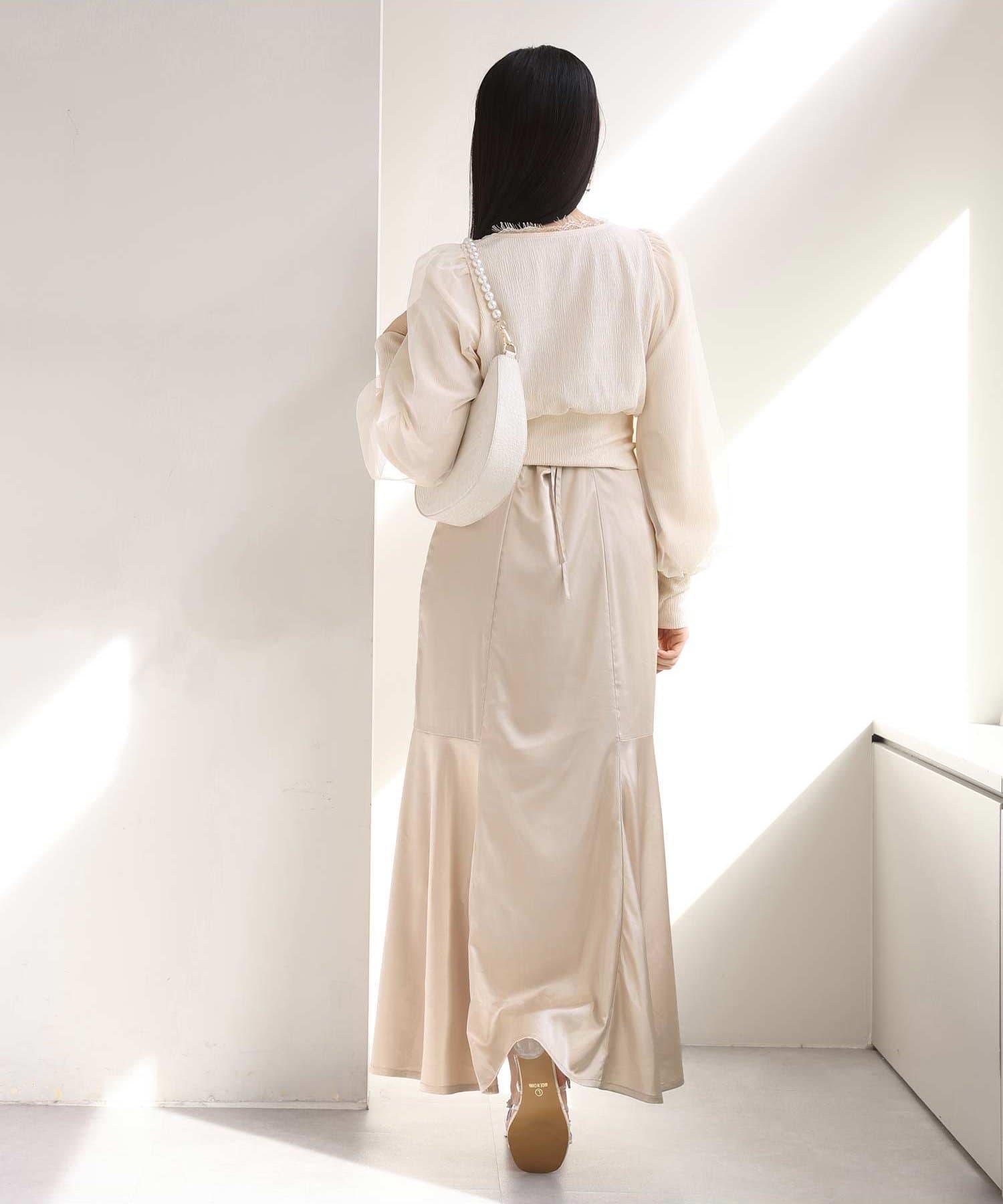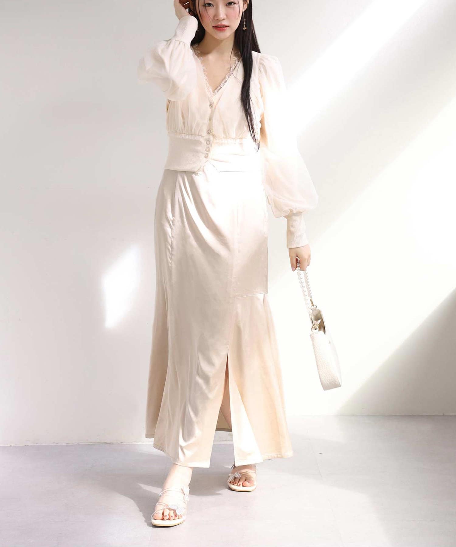 サテン生地のキャミワンピと透け感のあるトップスのセットで着るのはもちろん、