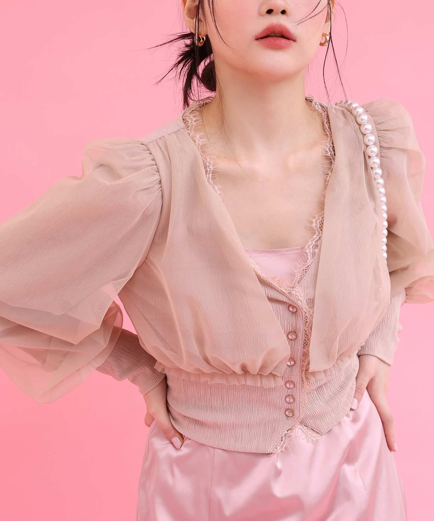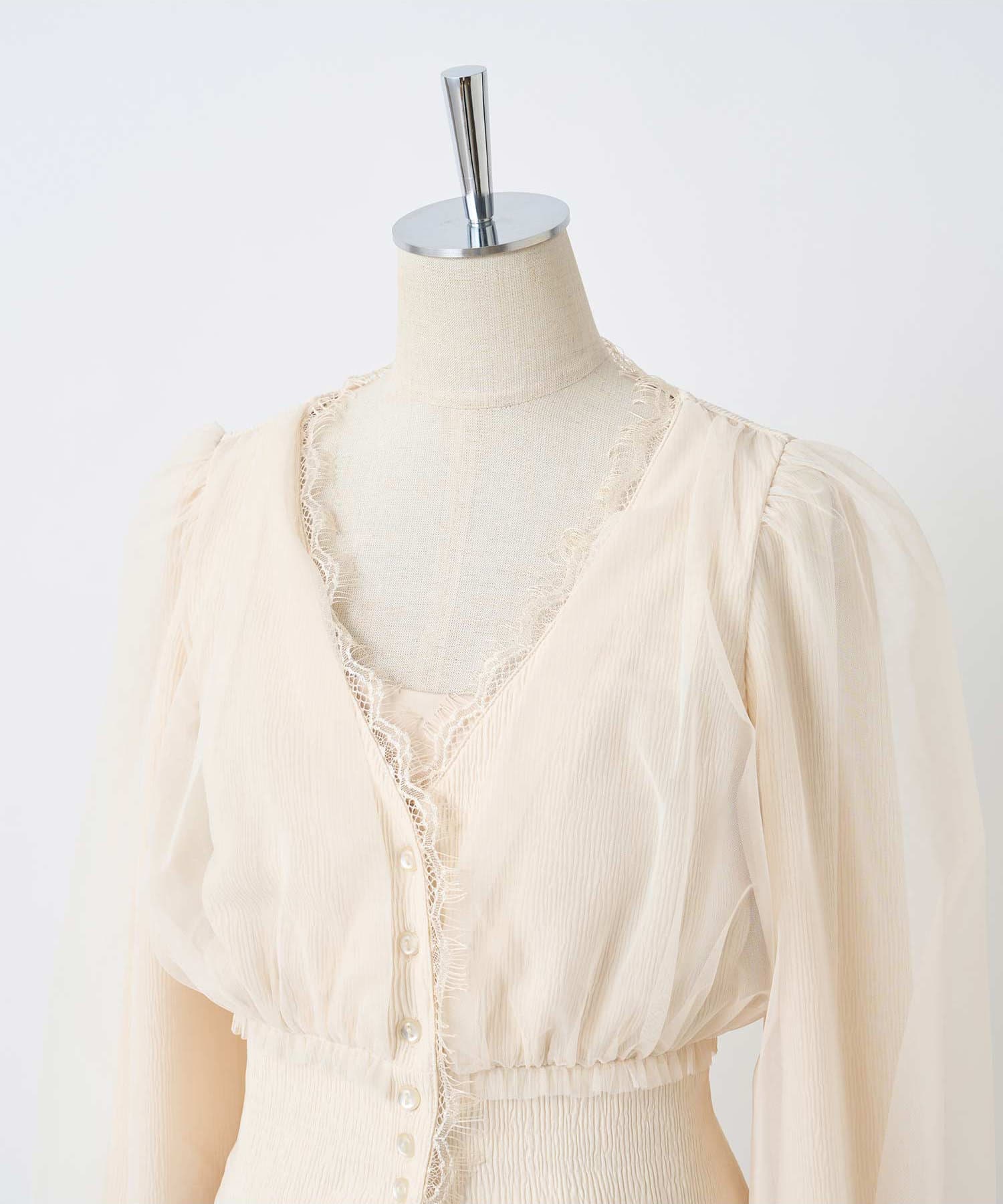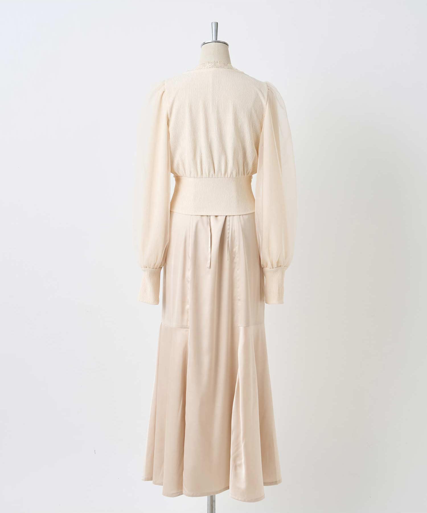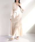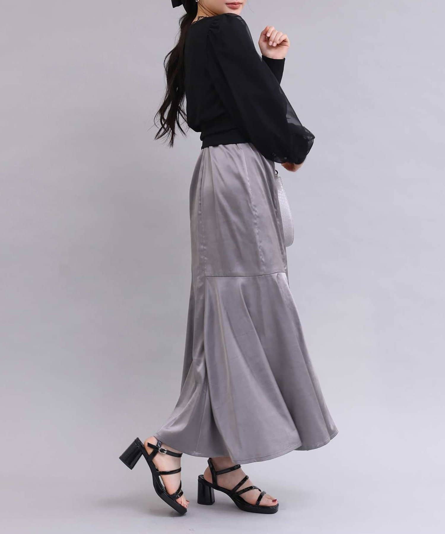 サテン生地のキャミワンピと透け感のあるトップスのセットで着るのはもちろん、