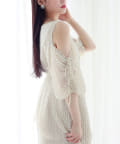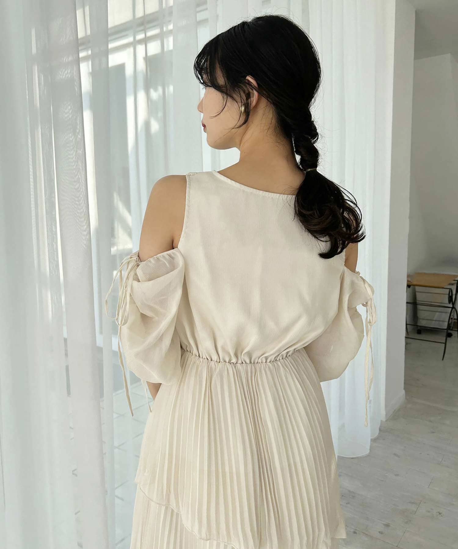 袖に紐は通しているので、肩リボンを絞って結ぶことで、肩の開き具合を調節可能。