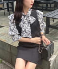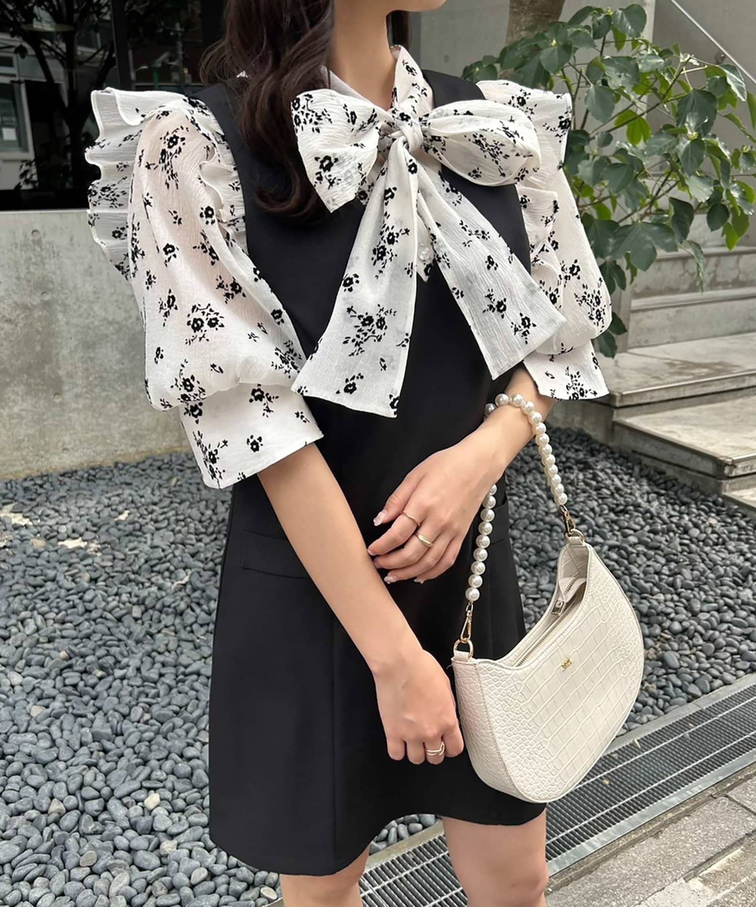 トップスは人気のボウタイブラウスで、単品での着回しも抜群です。