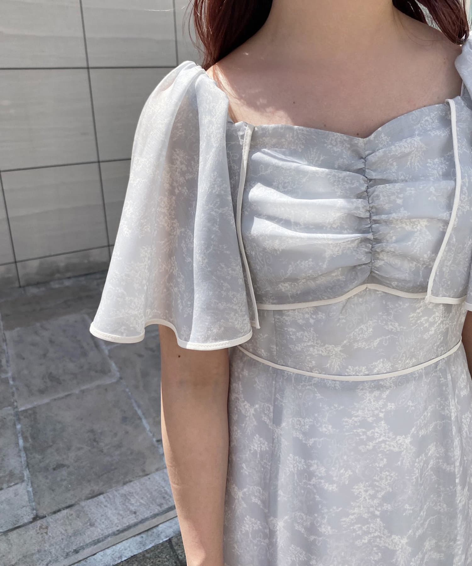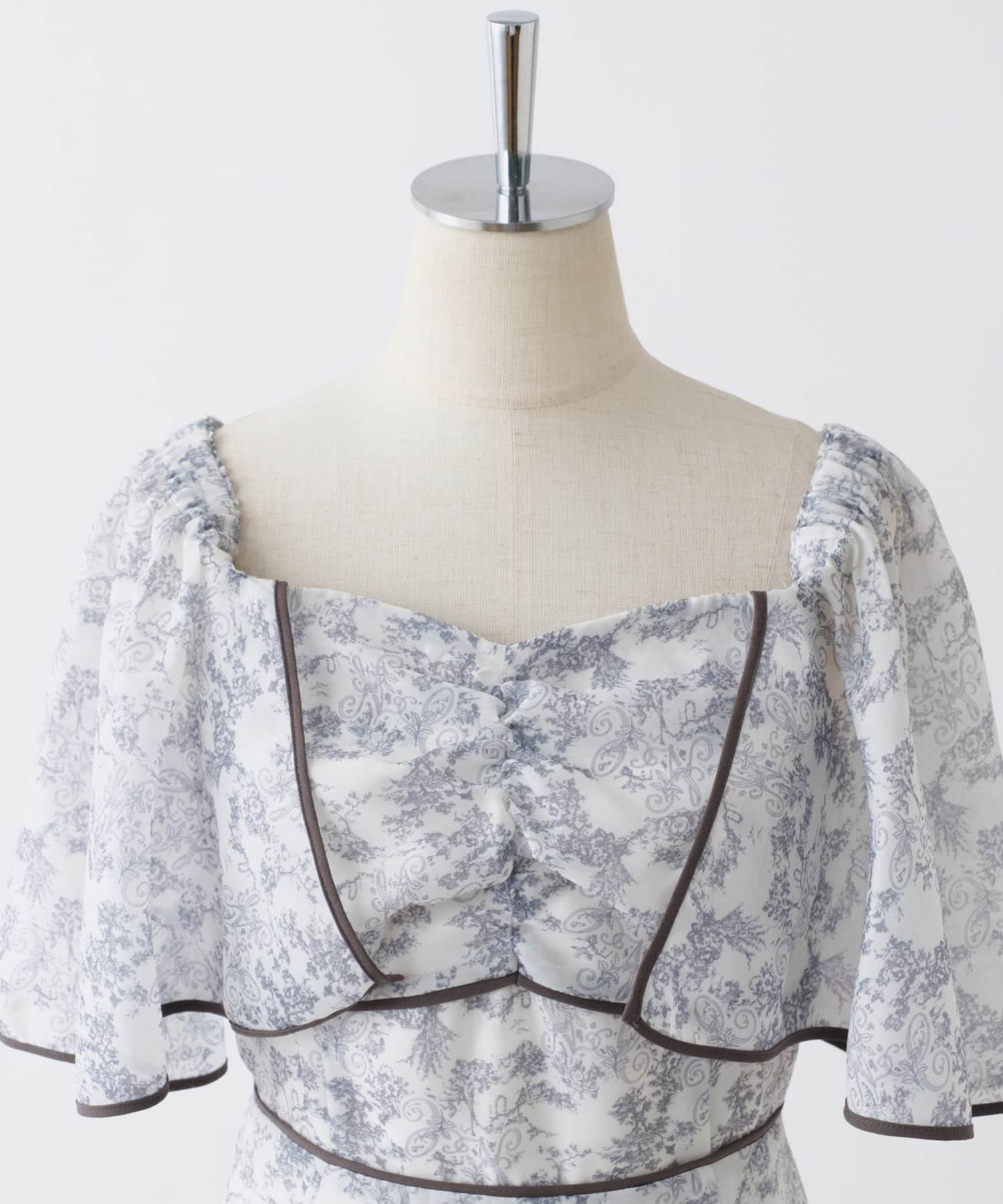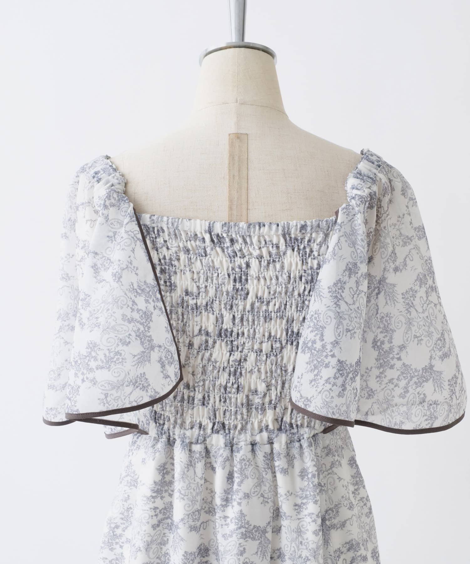 胸元のシャーリングのデザインと切り替えや裾に施されているパイピングがポイントになり、