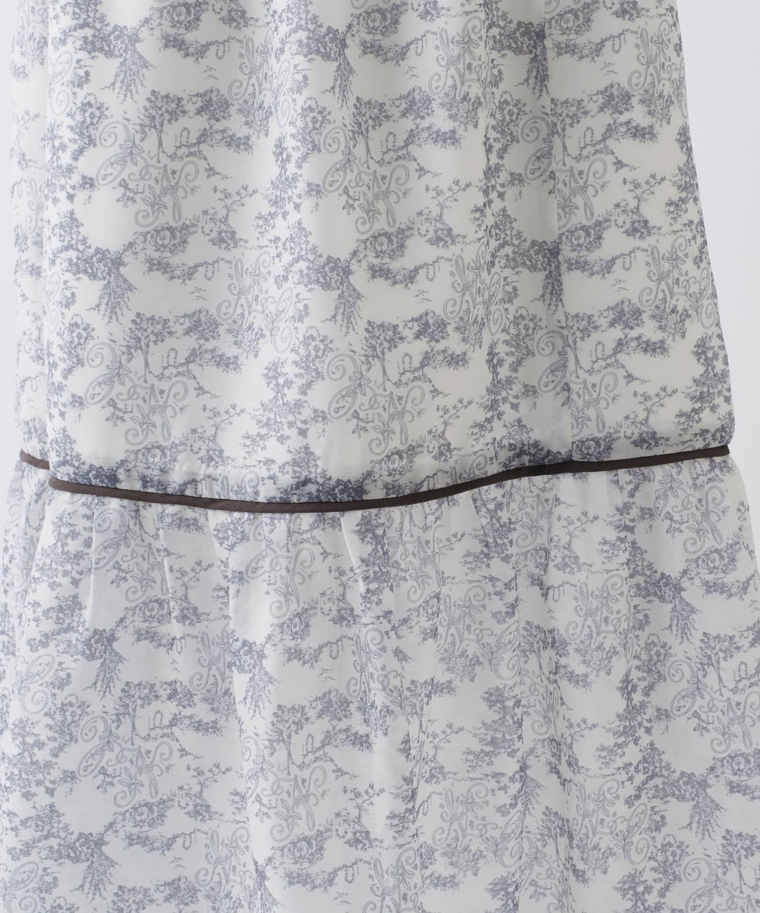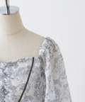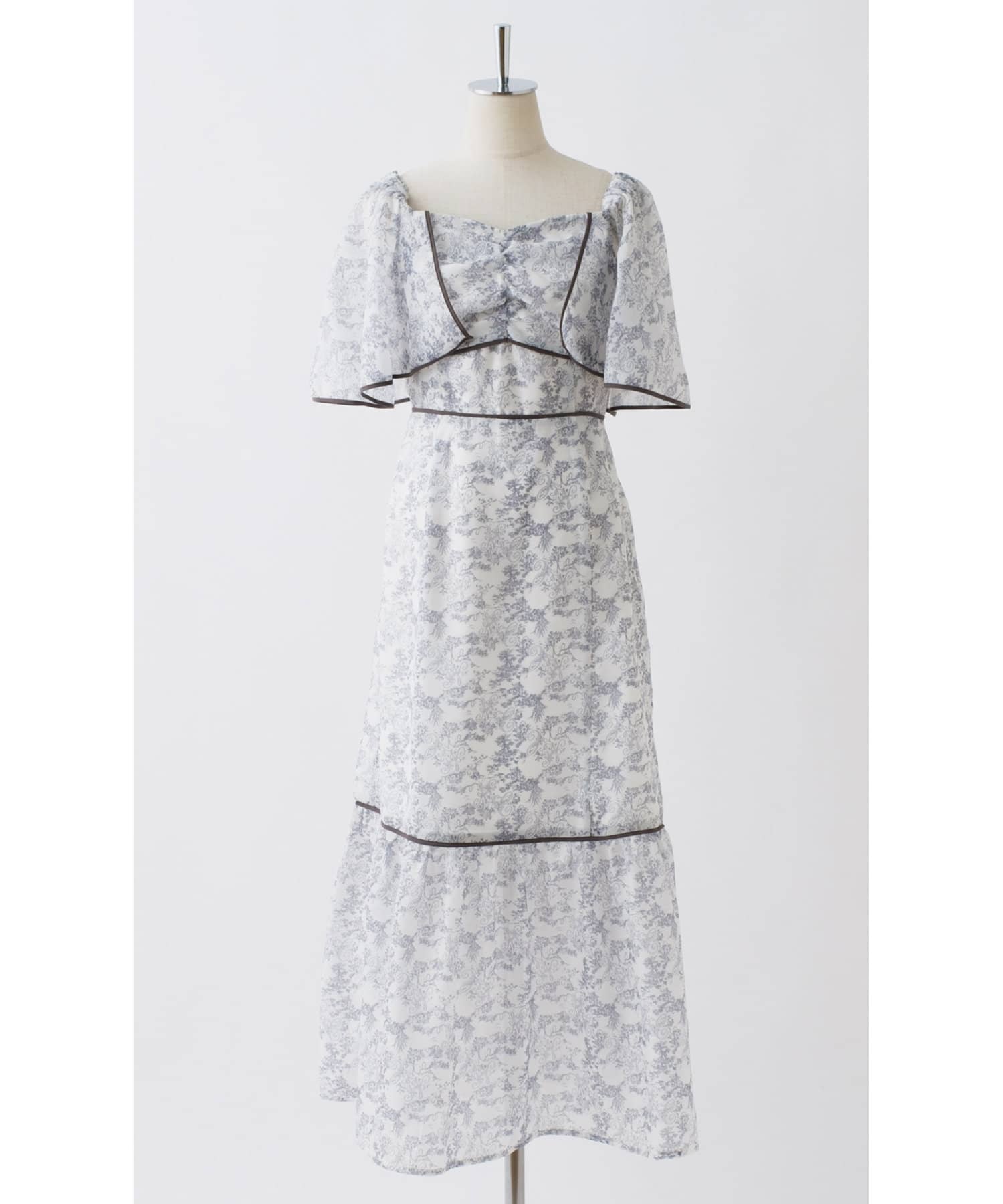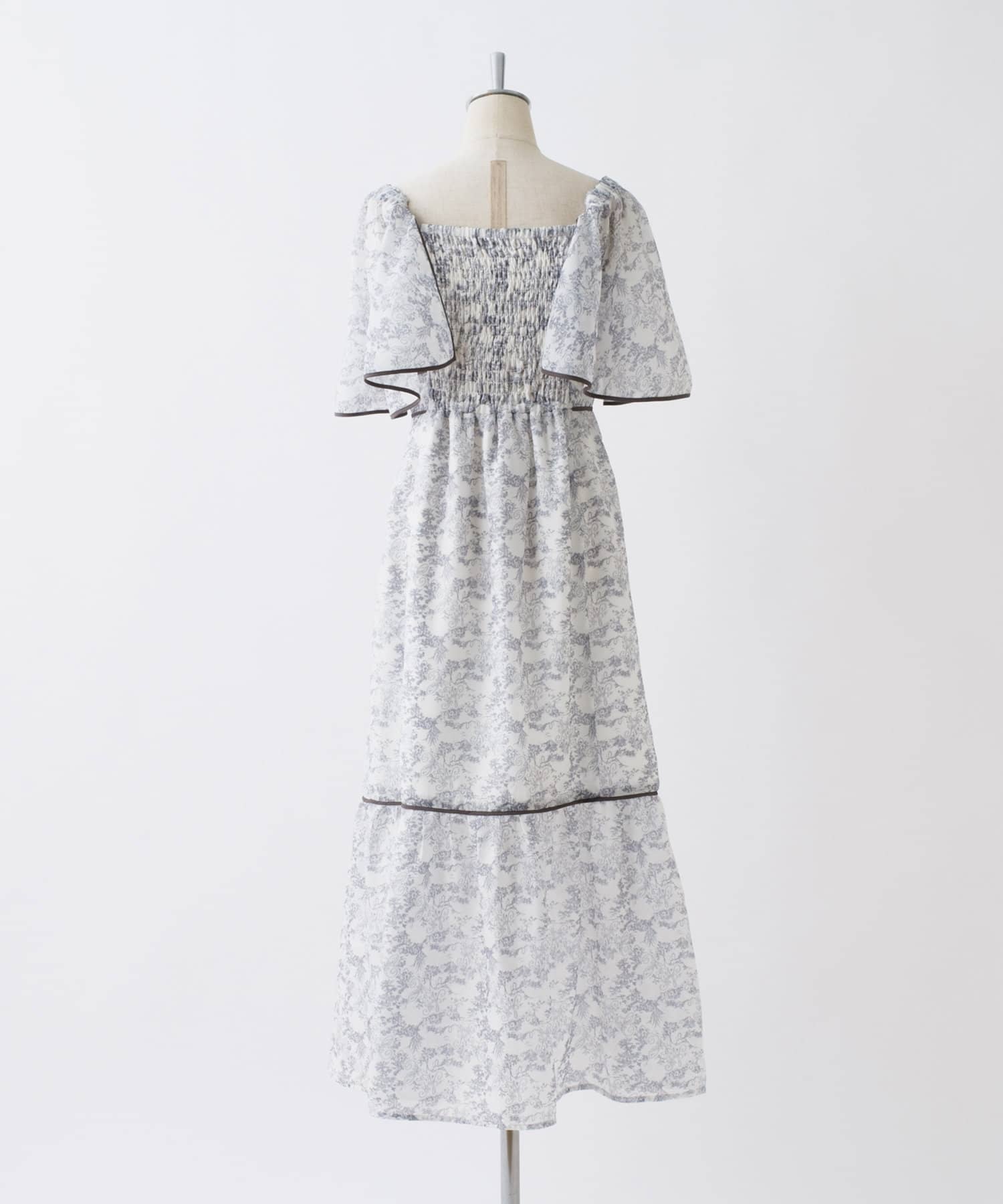 胸元のシャーリングのデザインと切り替えや裾に施されているパイピングがポイントになり、