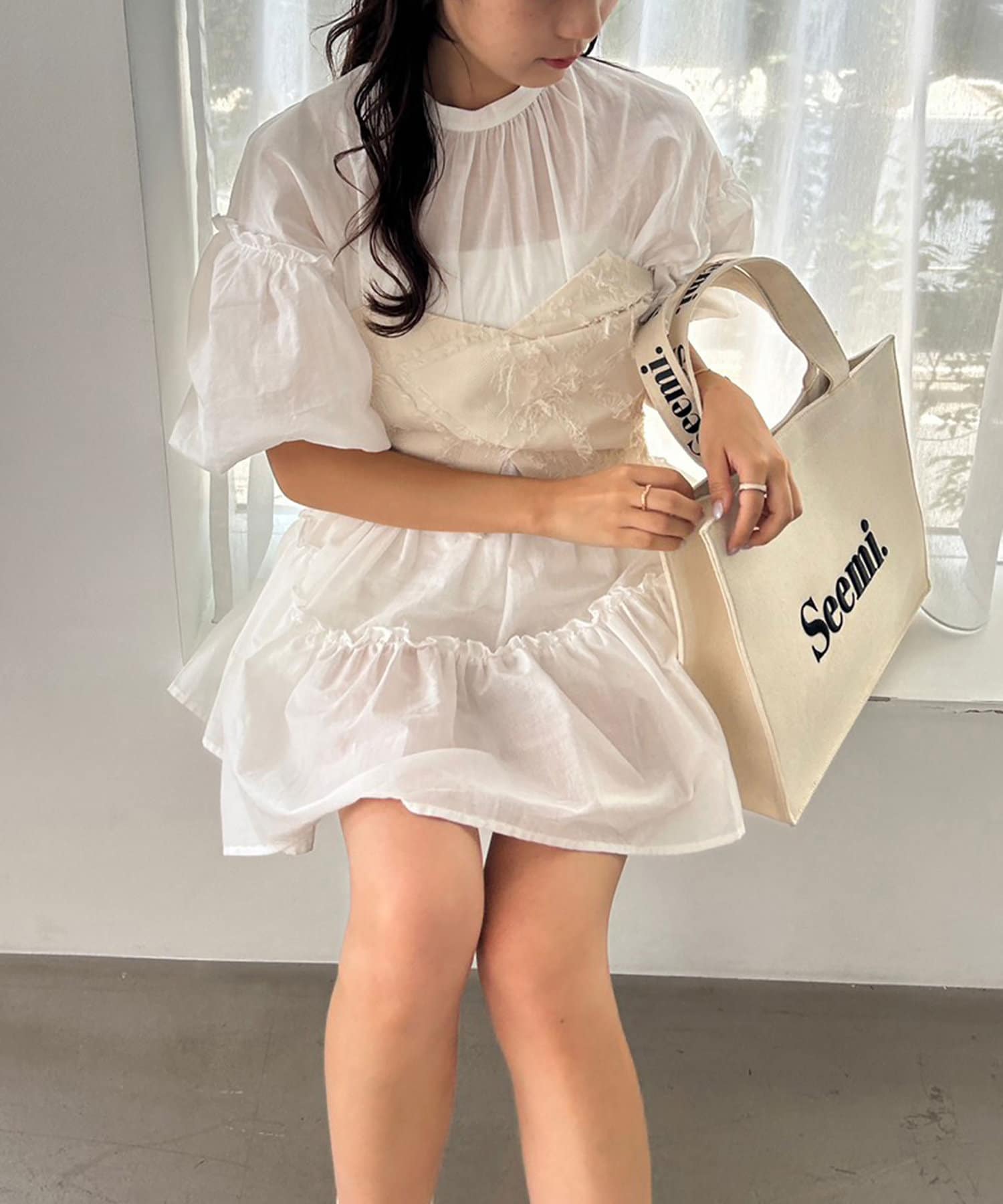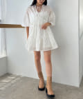 小柄な方はショートパンツと合わせてワンピース風な着こなしがオススメです。