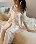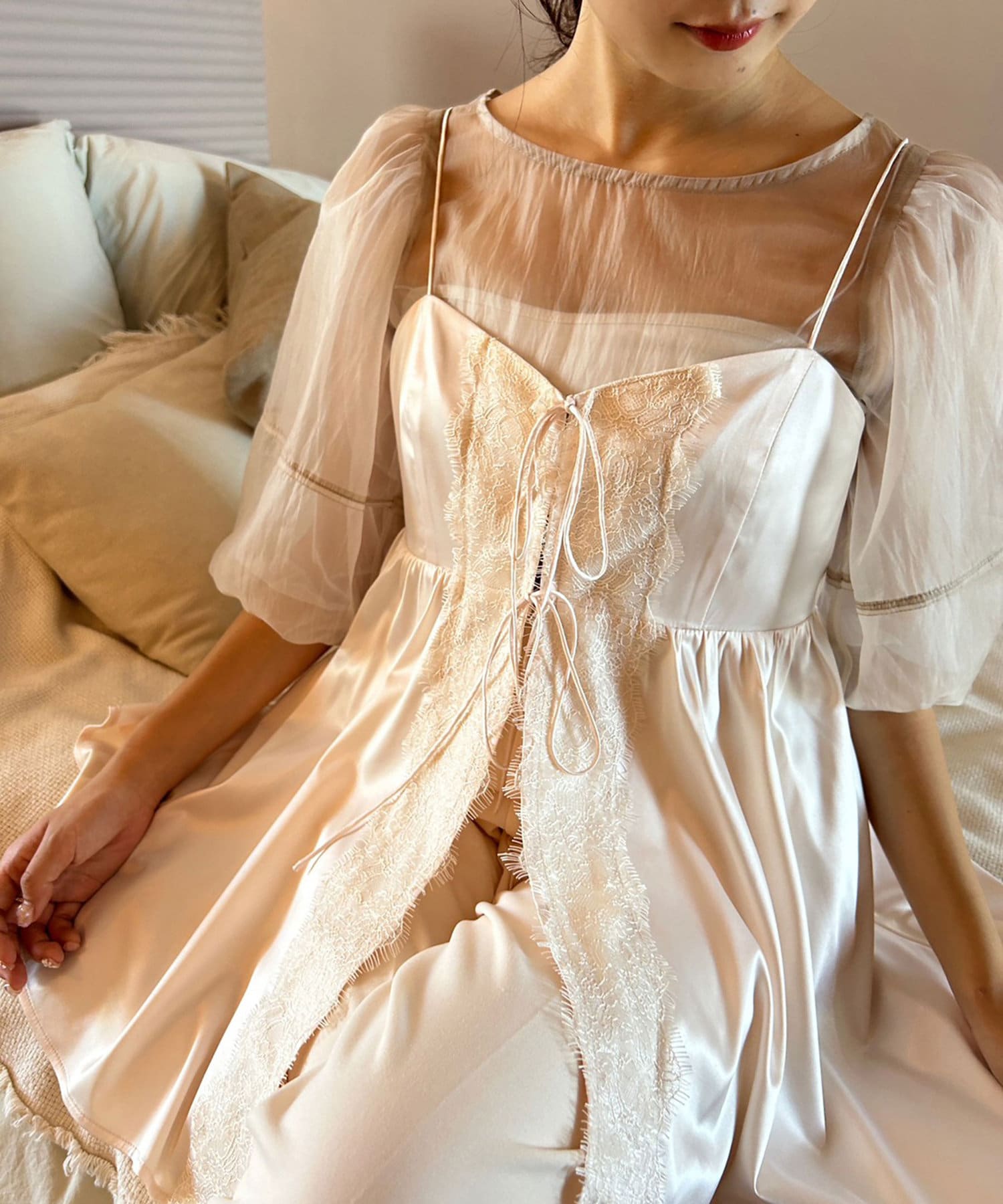 少し光沢感のあるサテン素材と繊細なレース使いが高見えするデザインです。
