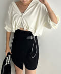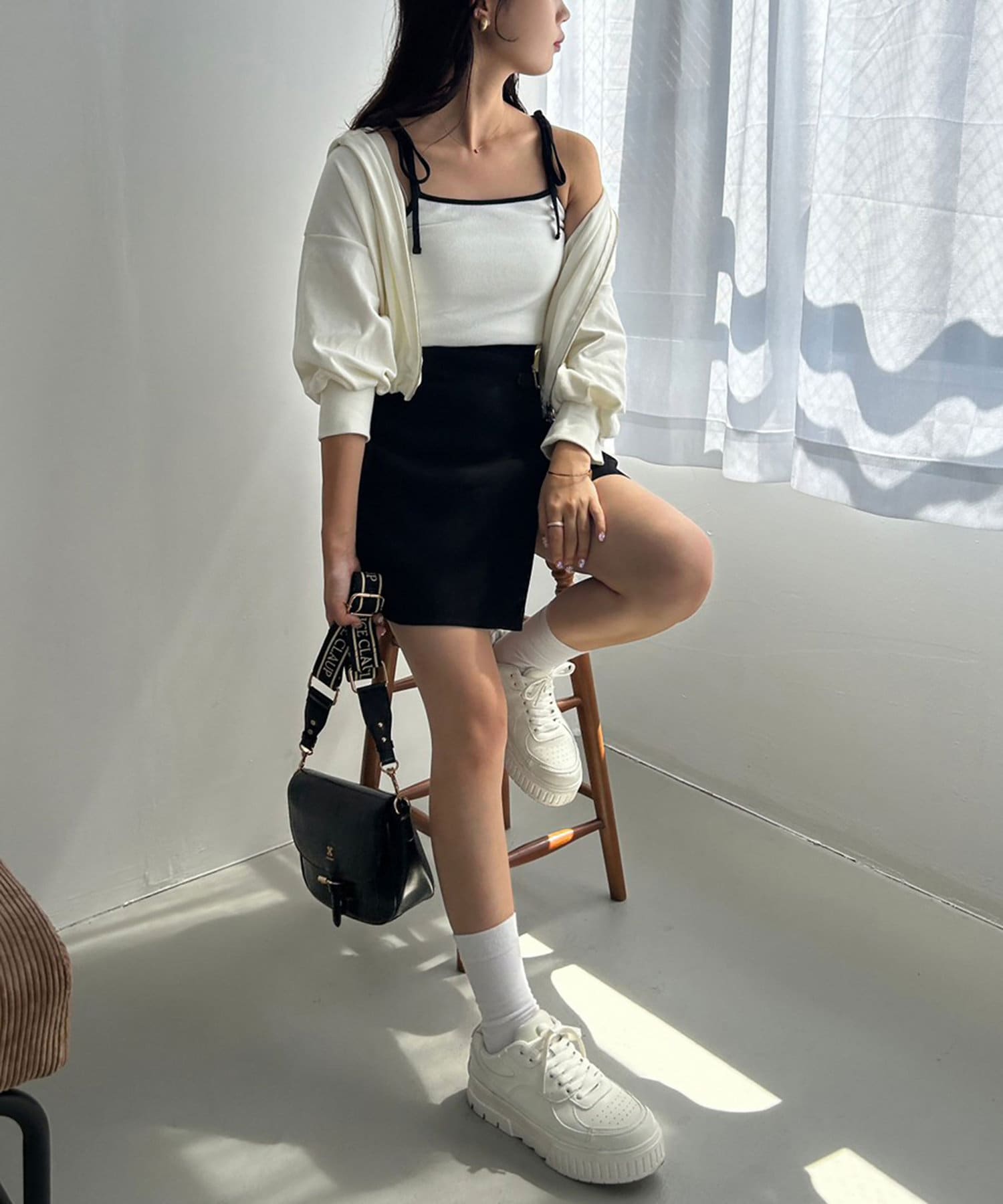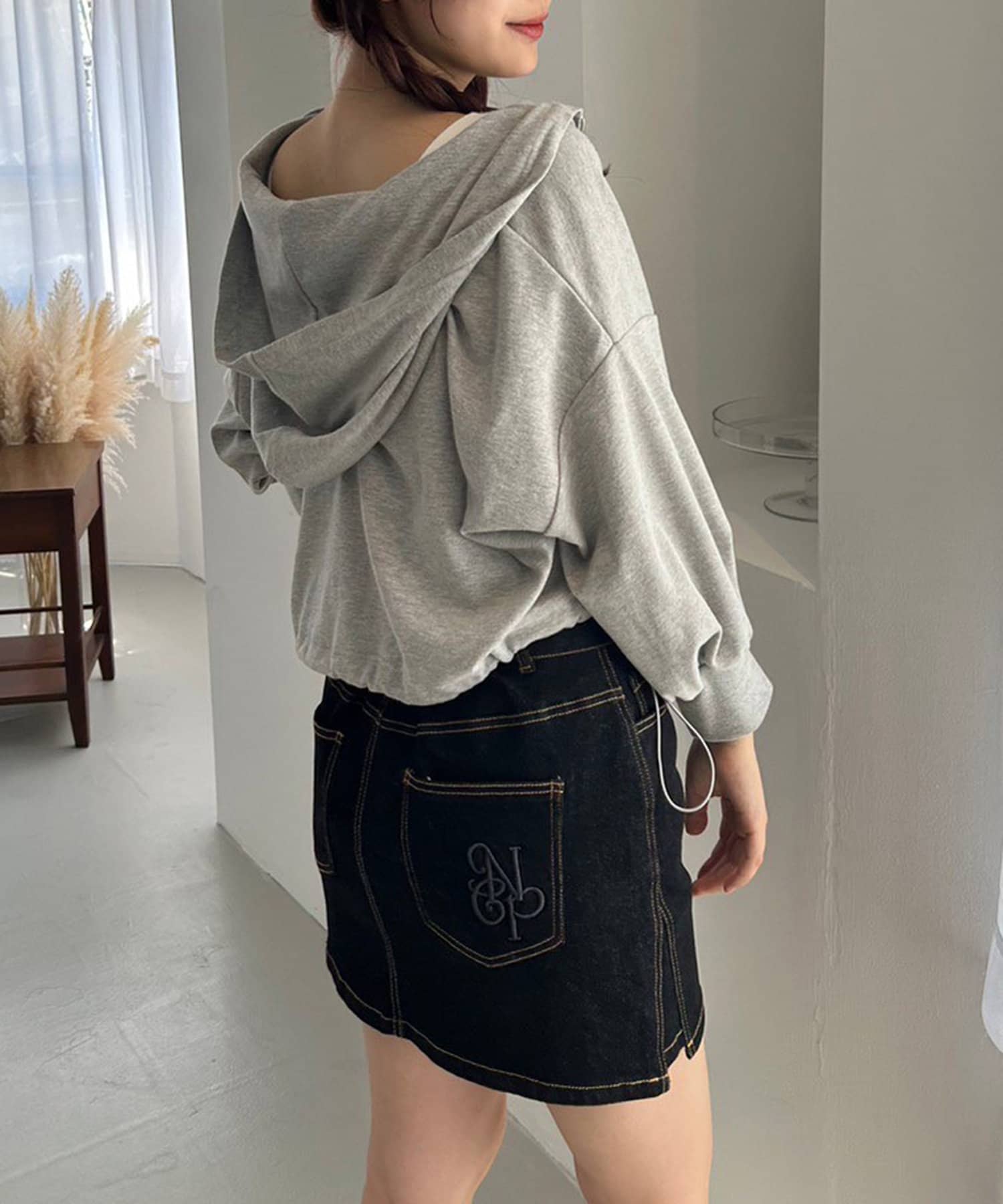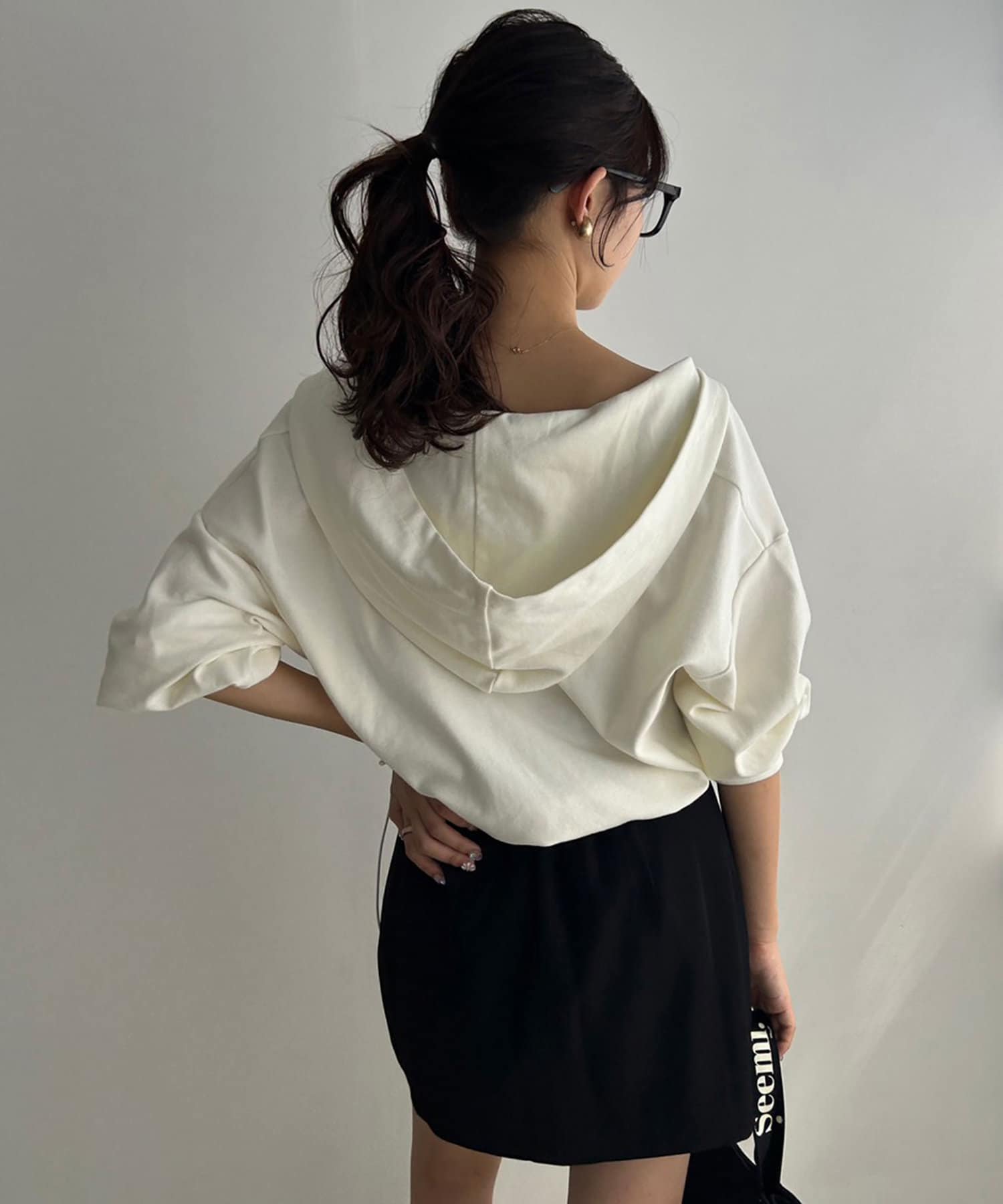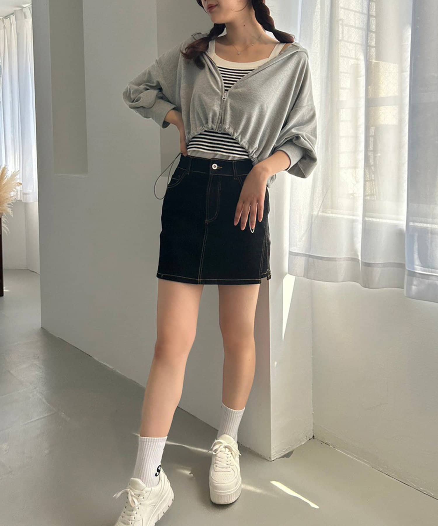 カジュアルな印象になるアイテムなので、ボトムはスカートなどで抜け感を出すのもオススメです。