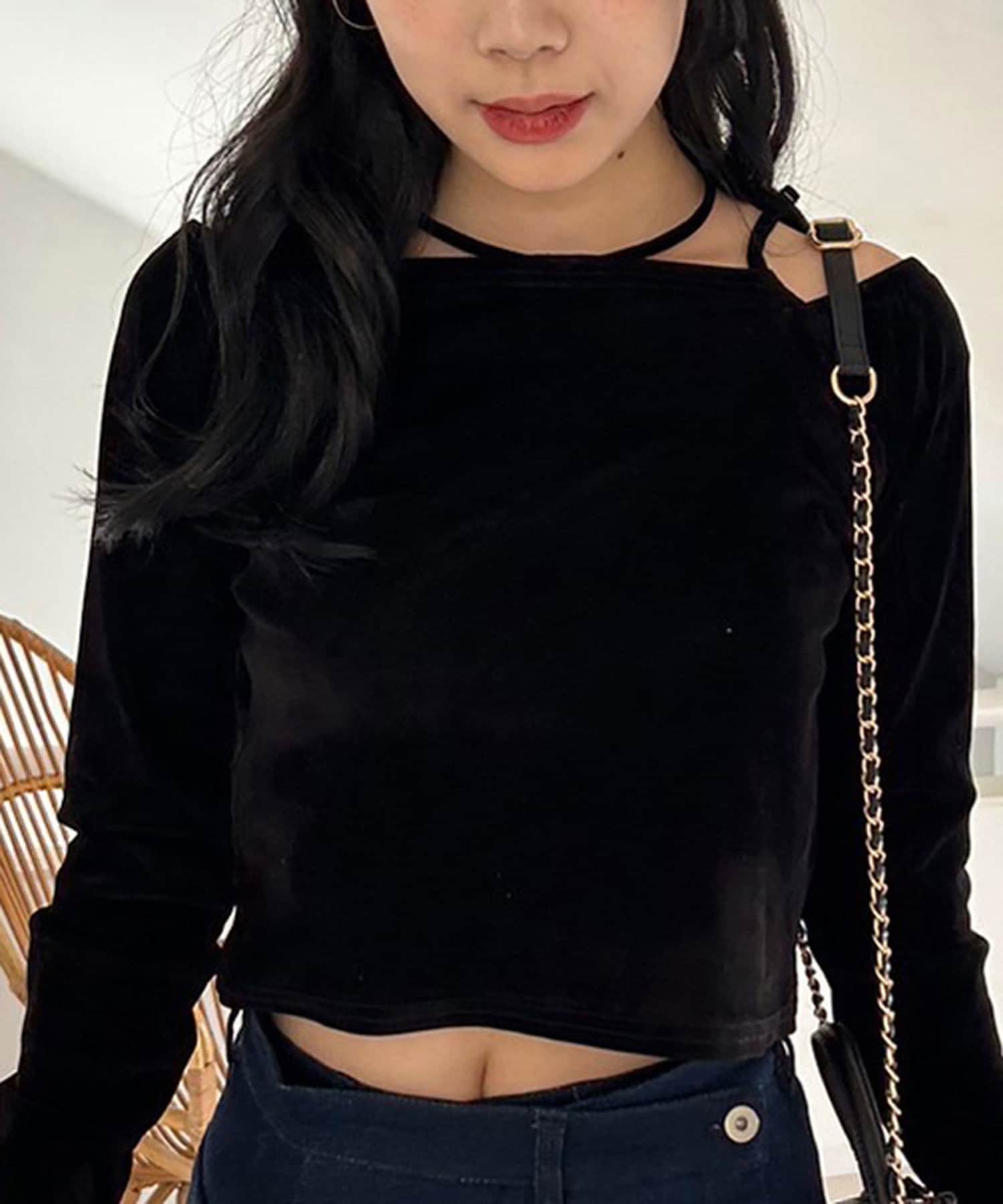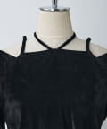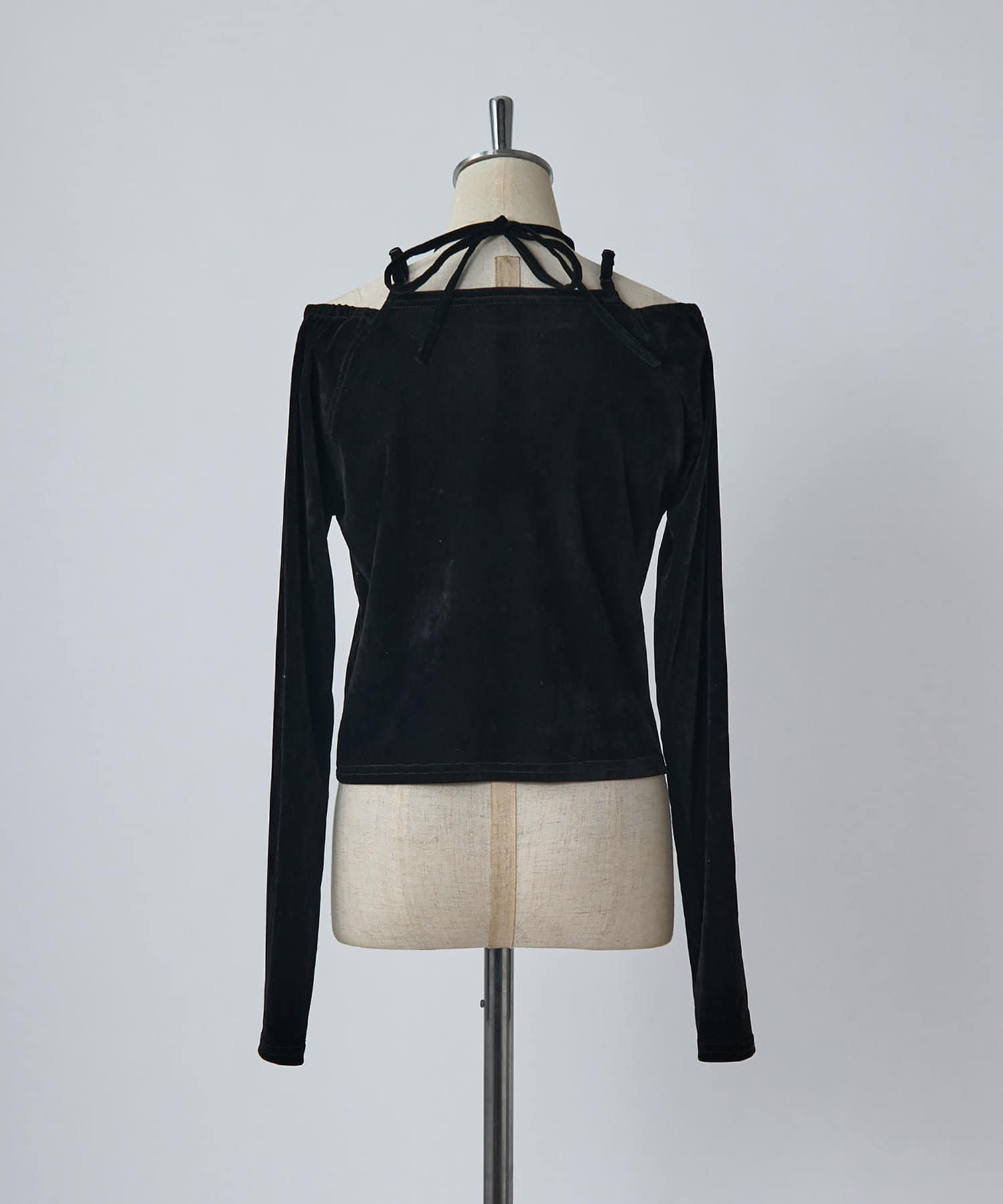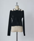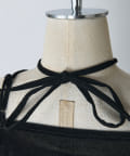 襟ぐりはスッキリと見える、ボートネックにアクセントでホルターネック紐を付けてアクセントに。