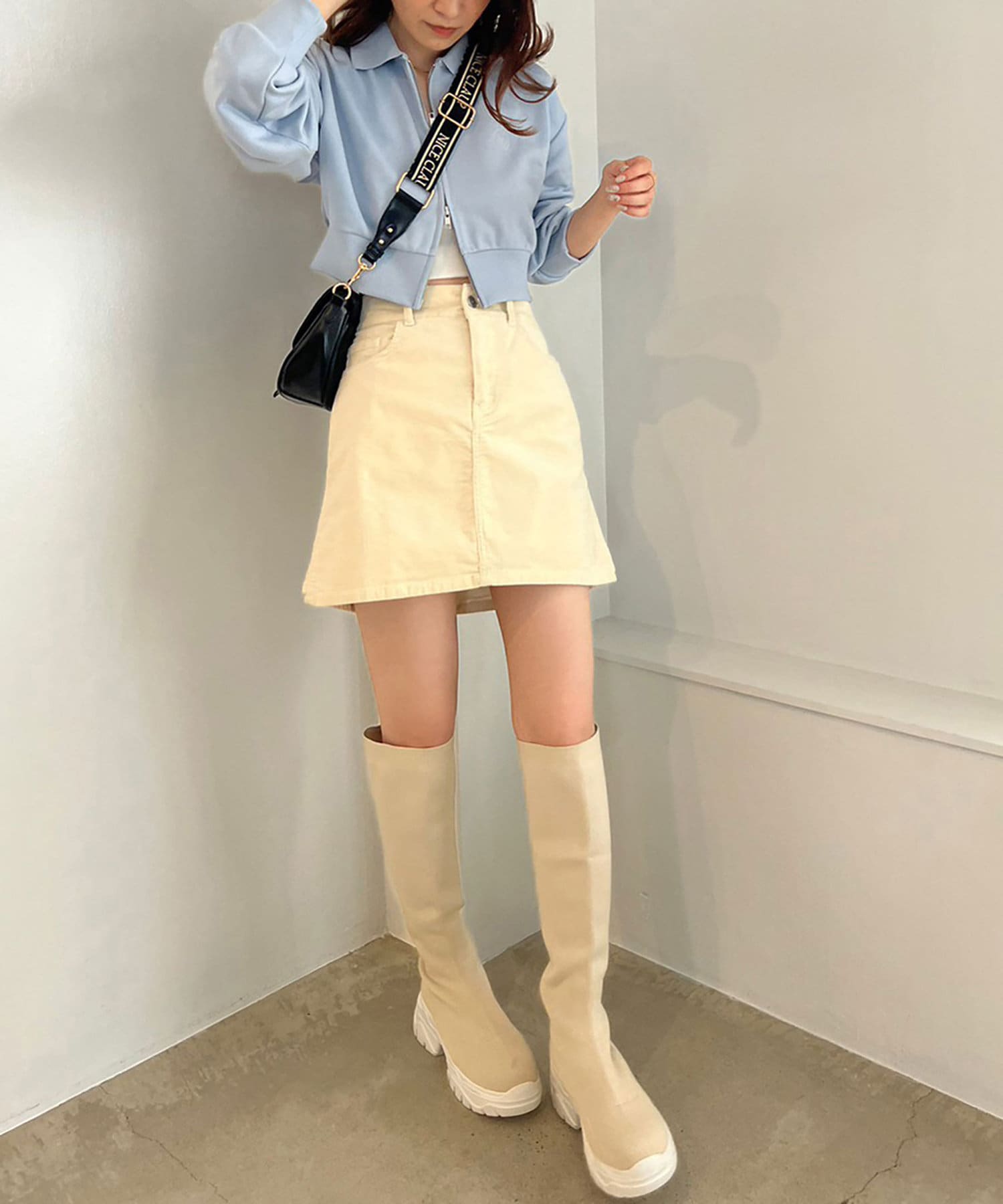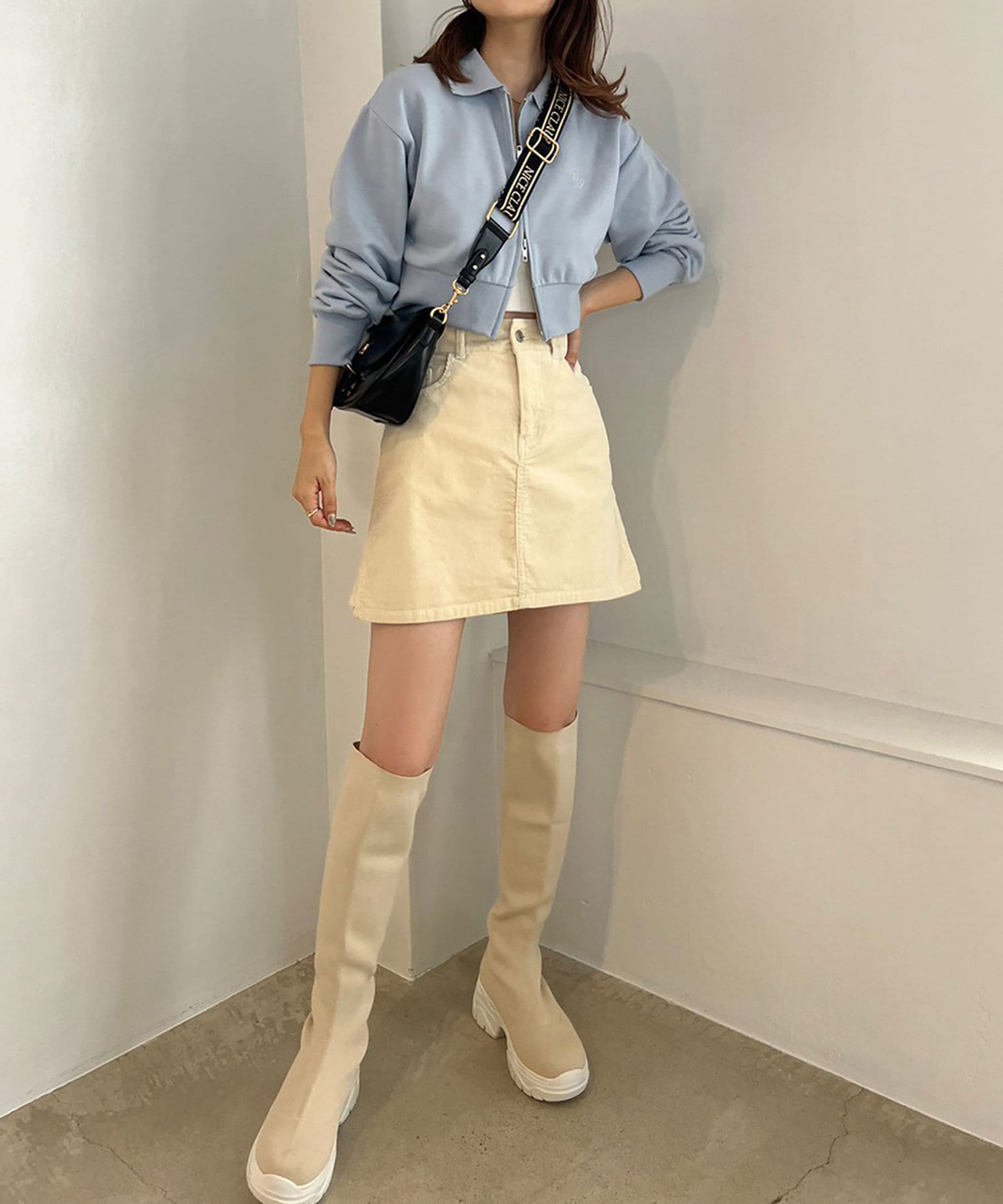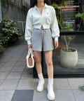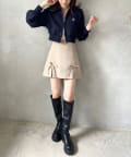 今期は、プリーツスカートなどのミニボトムでの合わせがオススメ。