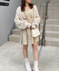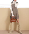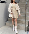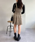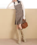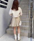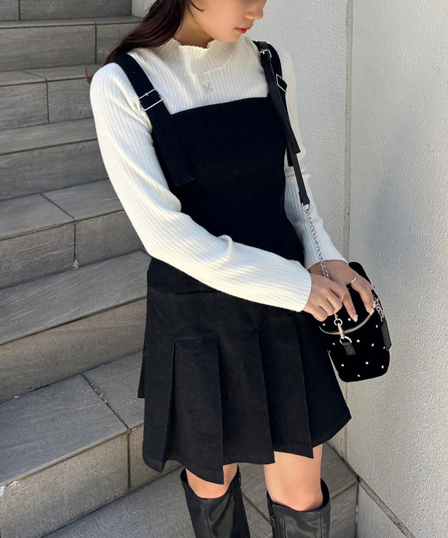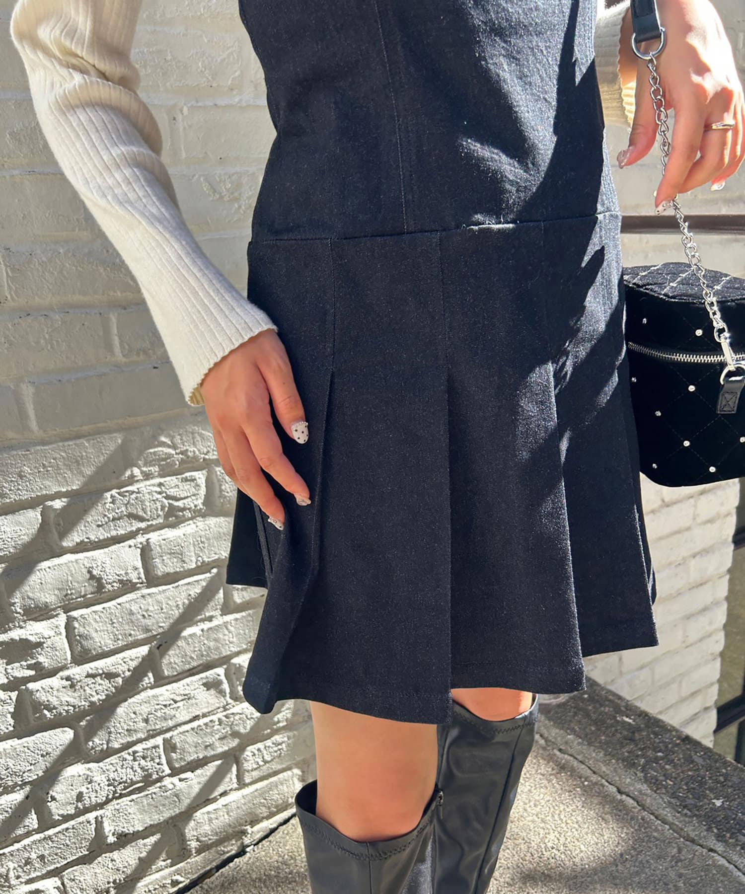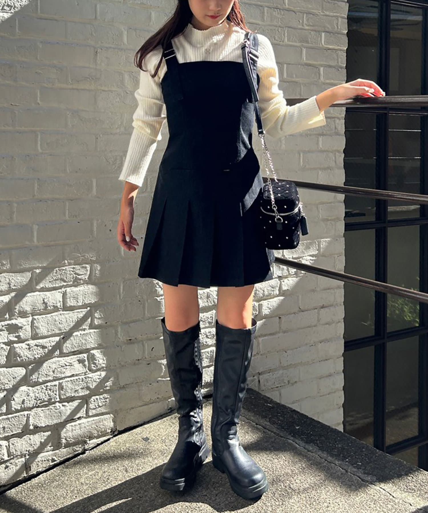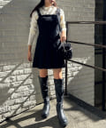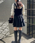 ミニ丈なので、ロングブーツで合わせることでバランスの取れたコーデに仕上がります。