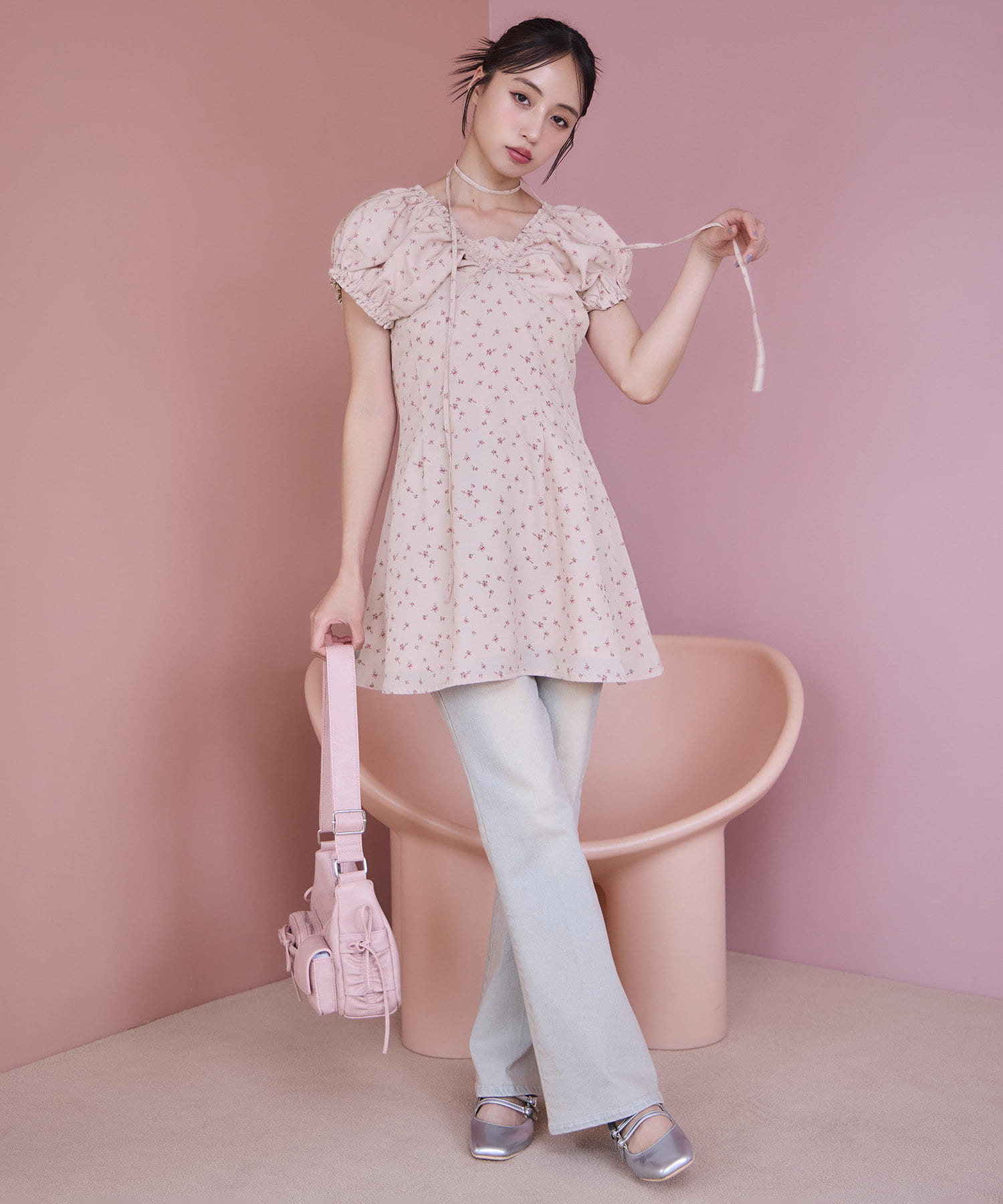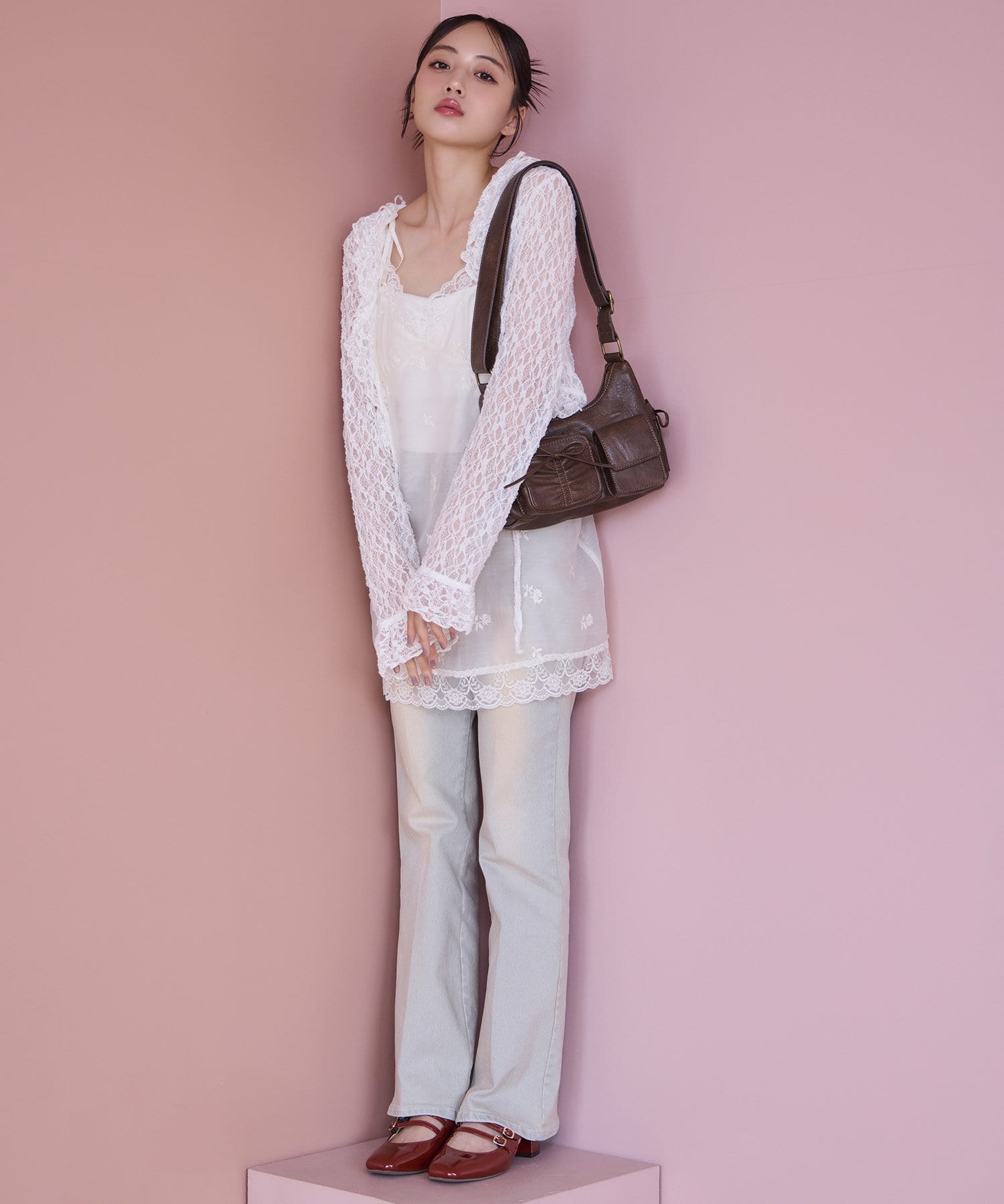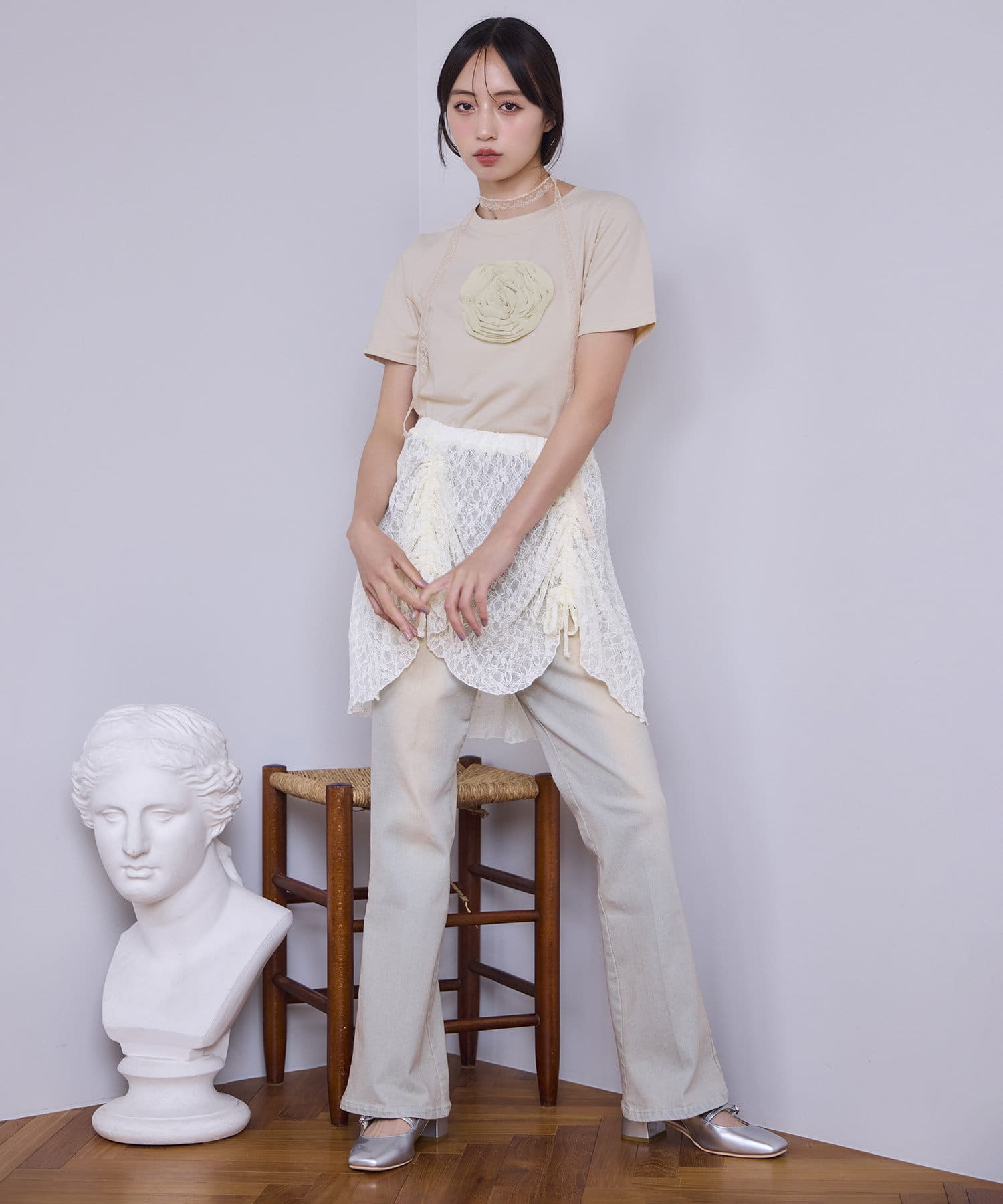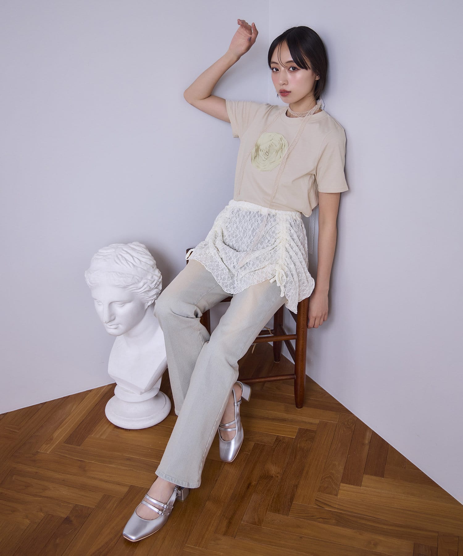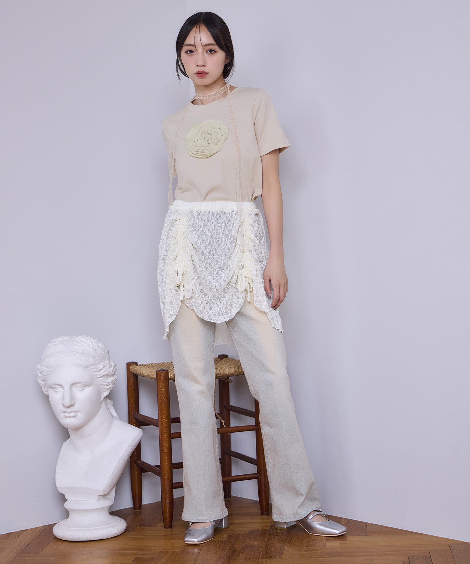 甘さの中にカジュアルなデニムを入れることによってフレンチカジュアルなコーデになります。