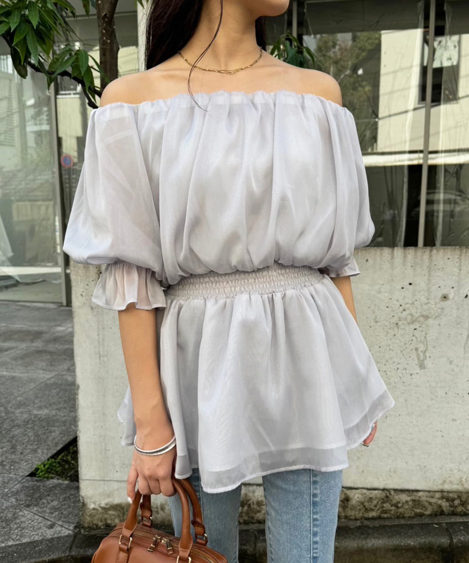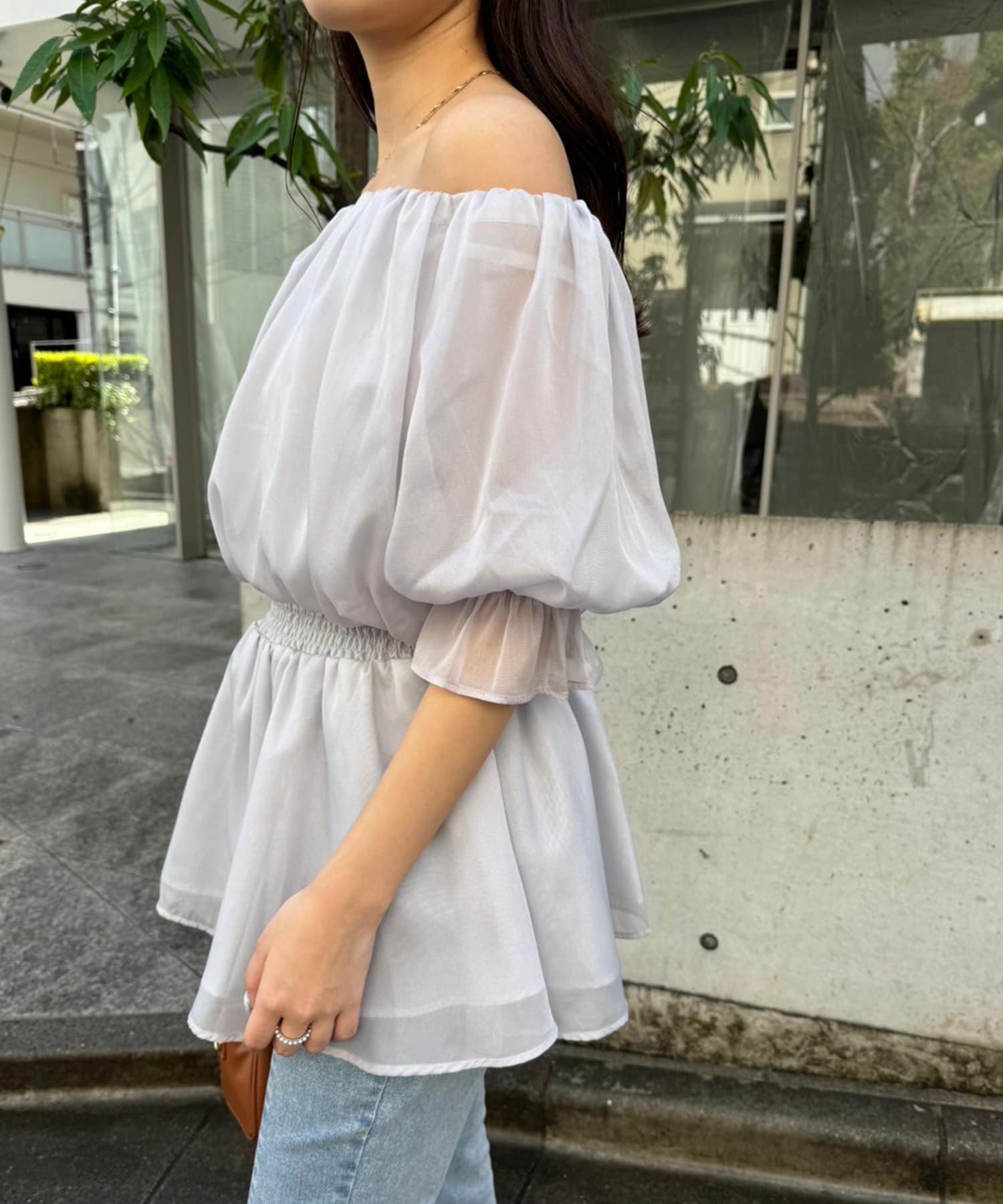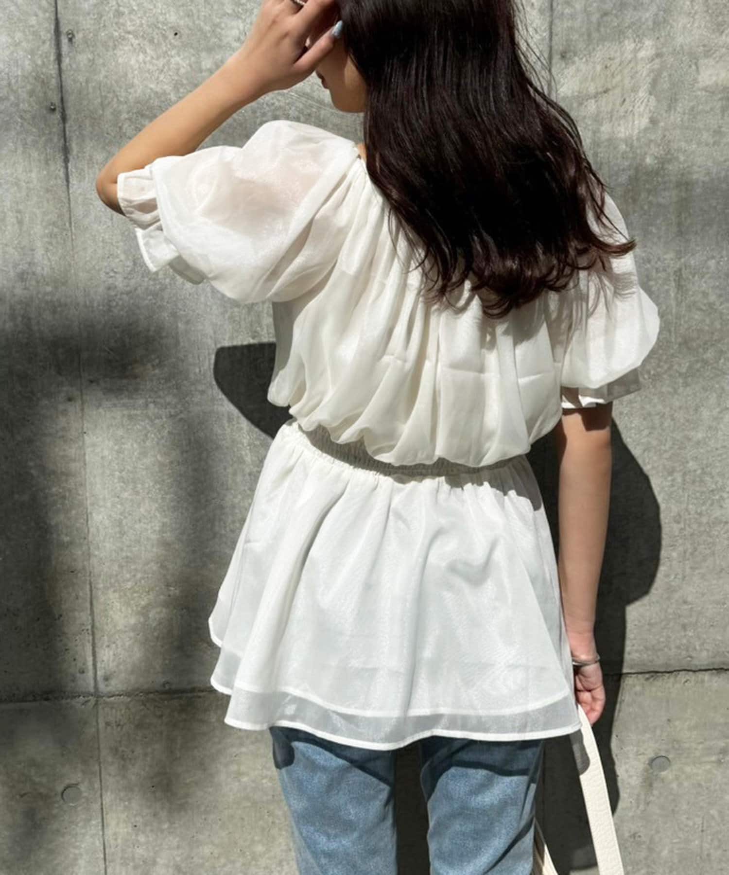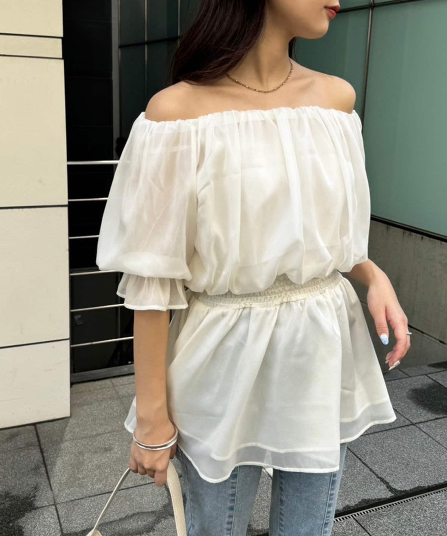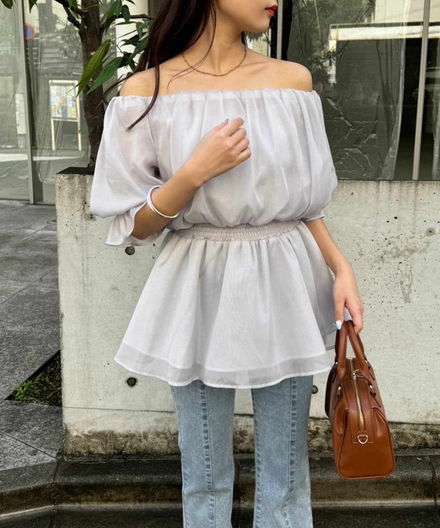 オフショルでも着られるオーガンジーのフェミニンブラウス