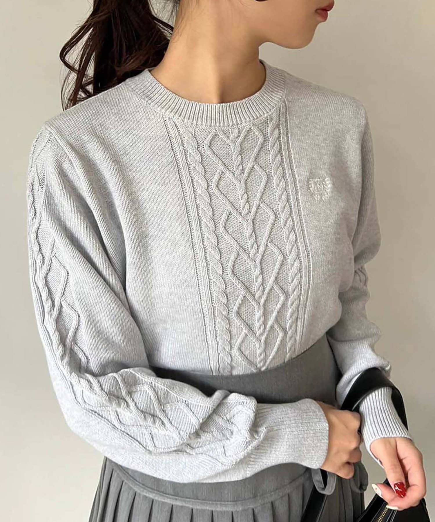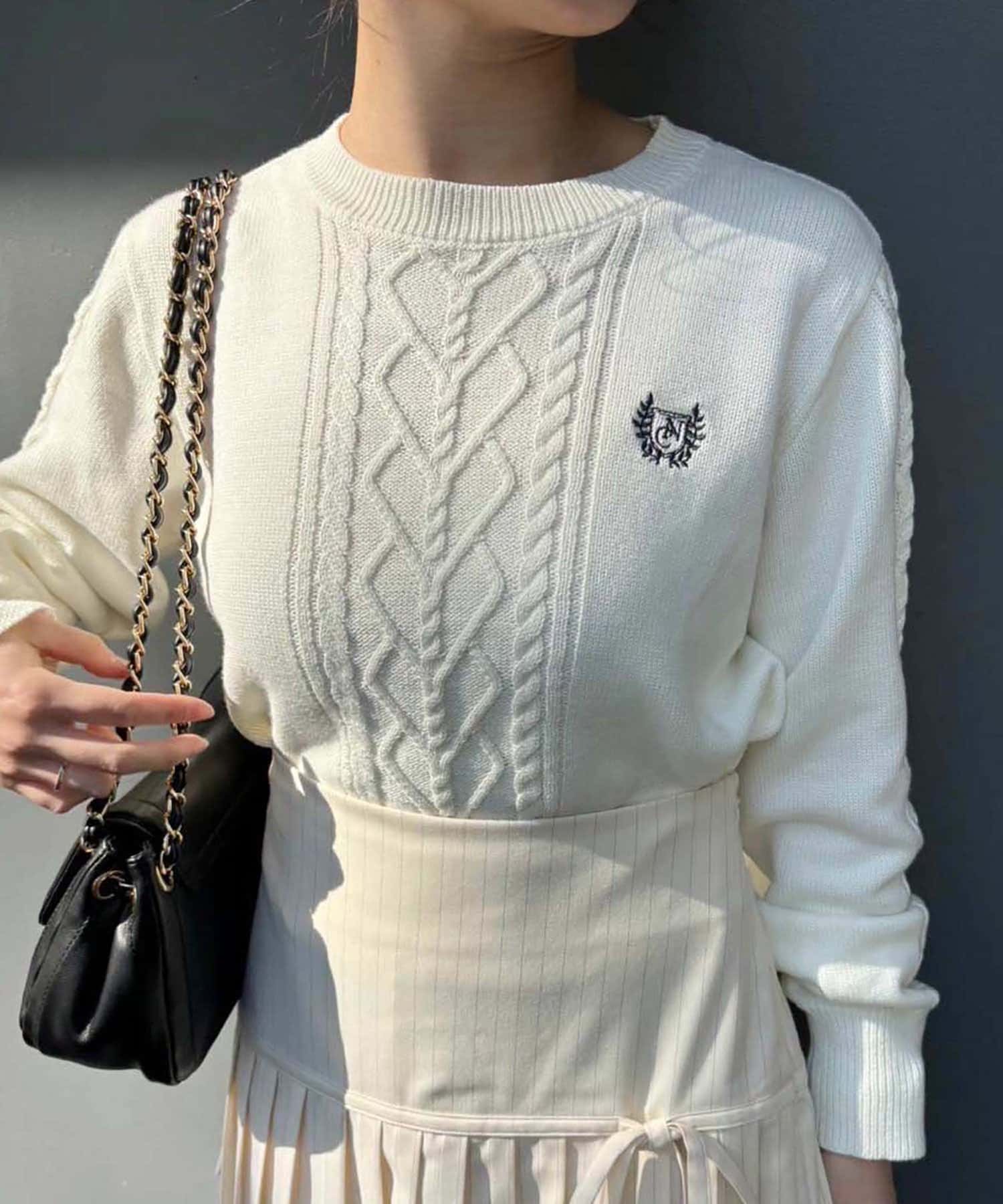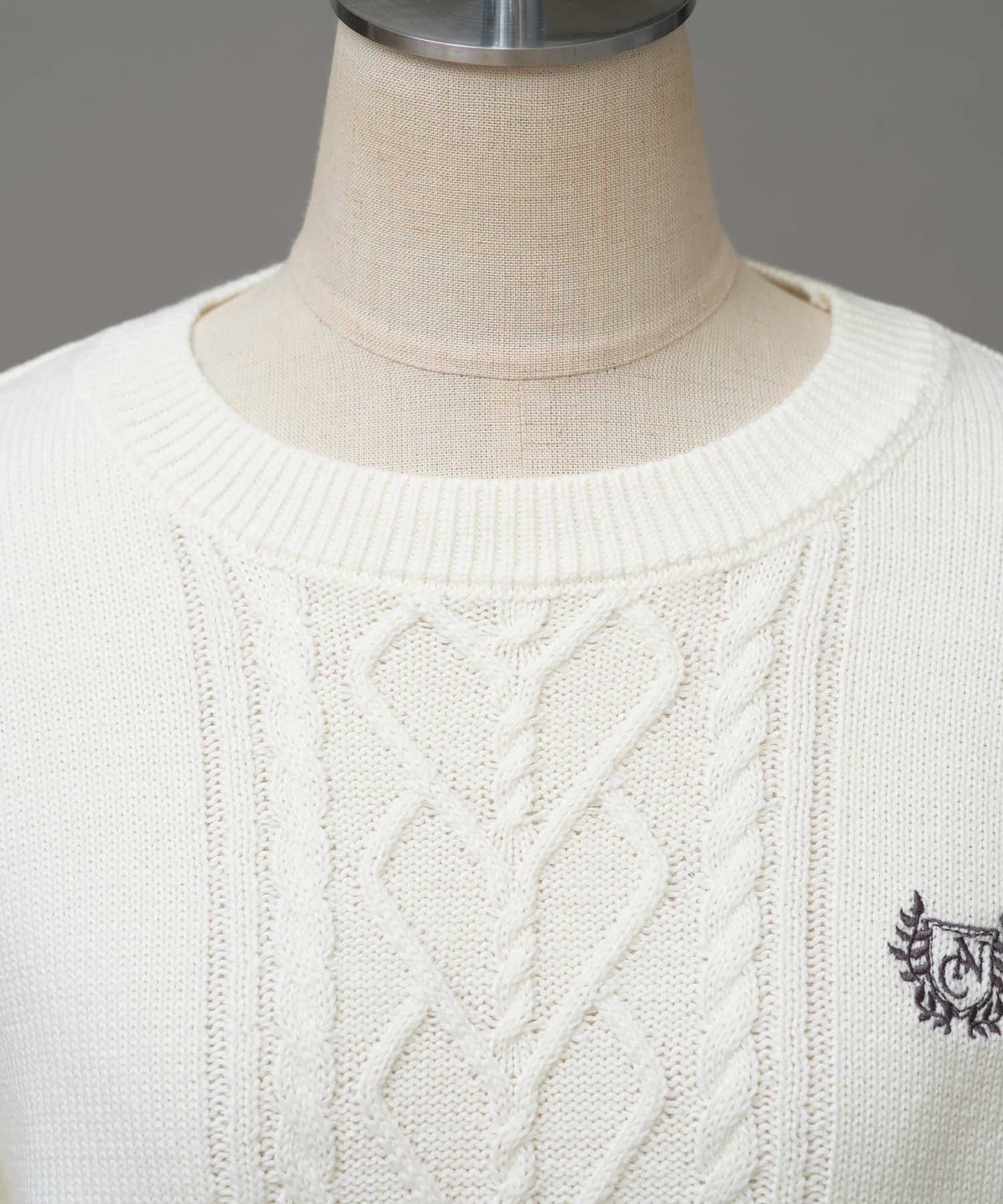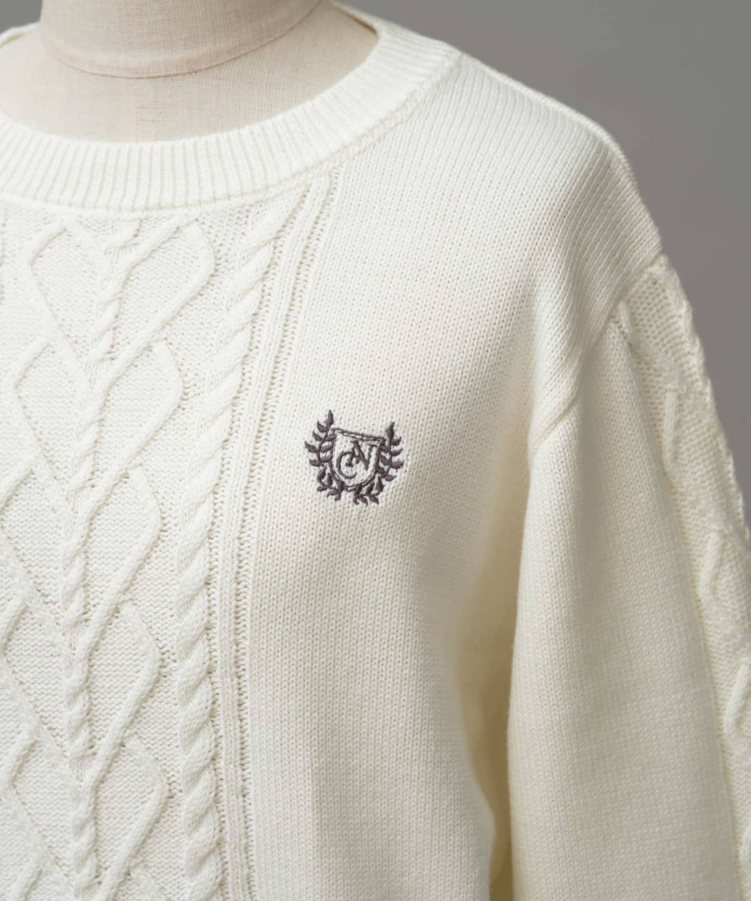 胸元のワンポイント刺しゅうロゴがアクセントのケーブルニット