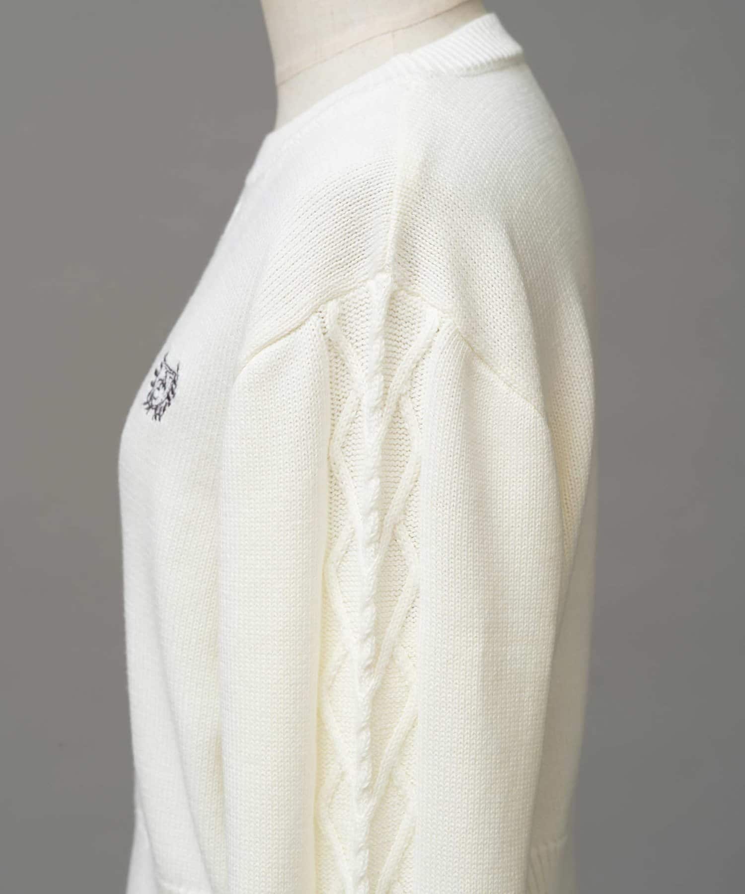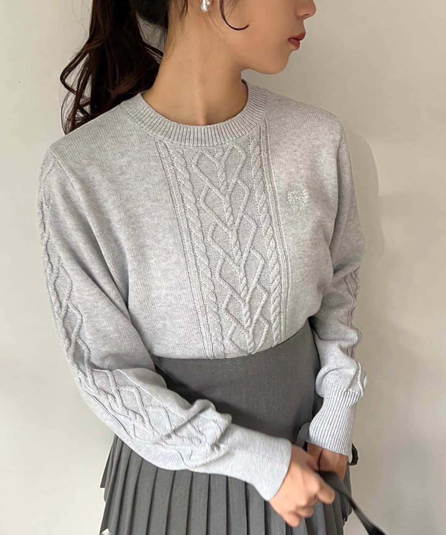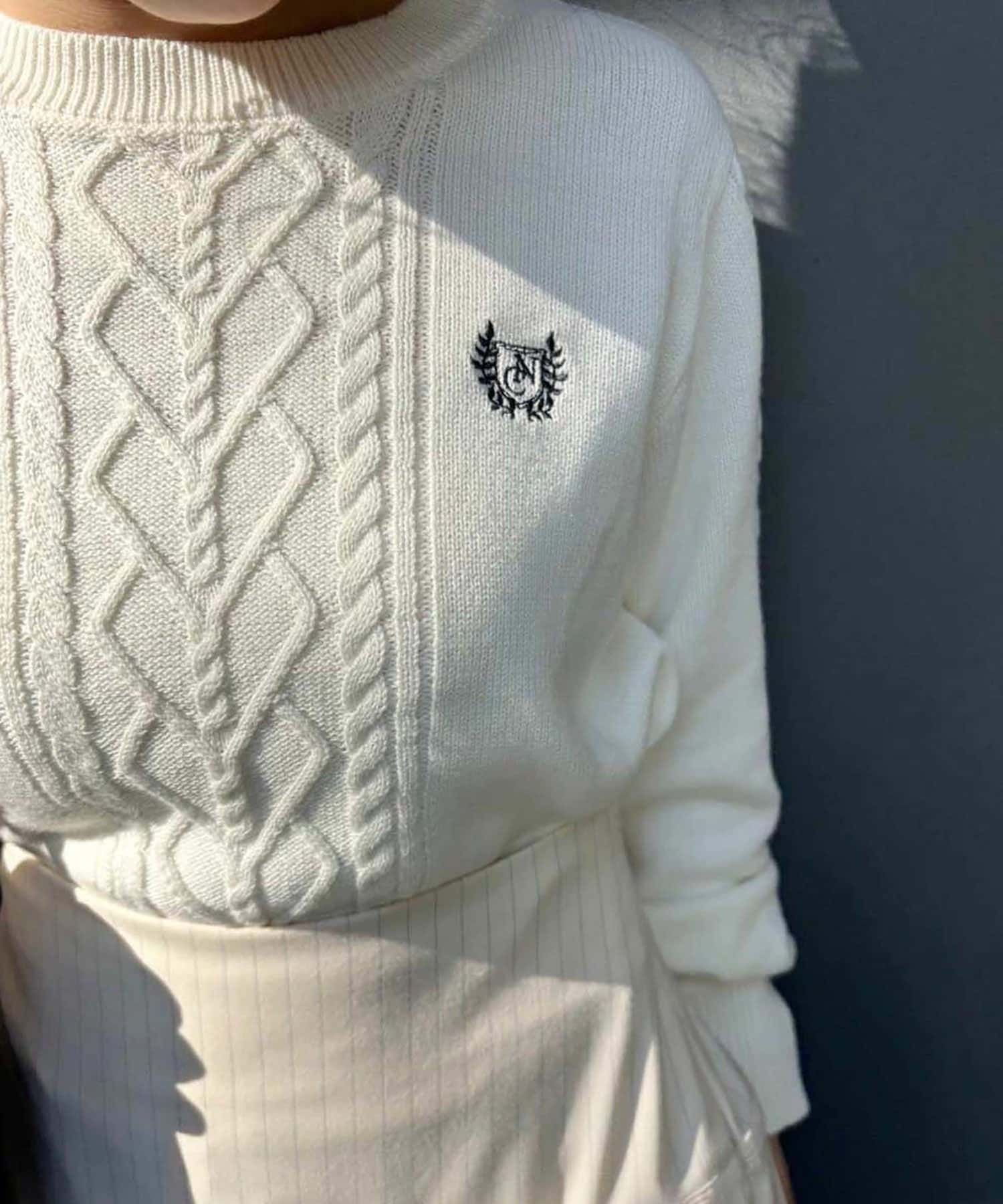 胸元のワンポイント刺しゅうロゴがアクセントのケーブルニット
